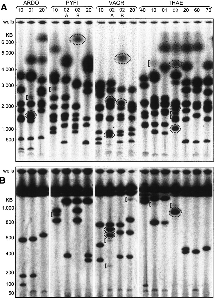(A) Genomic architecture and patterns of human inheritance of 45S ribosomal DNA gene clusters. Four families, “ARDO,” “PYFI,” “VAGR,” and “THAE” are shown. Relationship codes: (01) daughter, (02) son, (10) mother, (20) father, (40) maternal grandmother, (60) paternal grandmother, (70) paternal grandfather. Siblings of the same sex and generation are additionally designated “A,” “B” in descending birth order. (Dotted ovals) Bands not represented in either parent. (Square brackets) Bands of nonstoichiometric signal intensity. Cluster lengths are calibrated on chromosomal size standards from S. pombe, H. wingei, and S. cerevisiae and lambda phage concatemers. (B) High resolution. Note resolution of two bands at 600–700 kb in VAGR-02A with respect to the unresolved doublet in this size range in panel A.