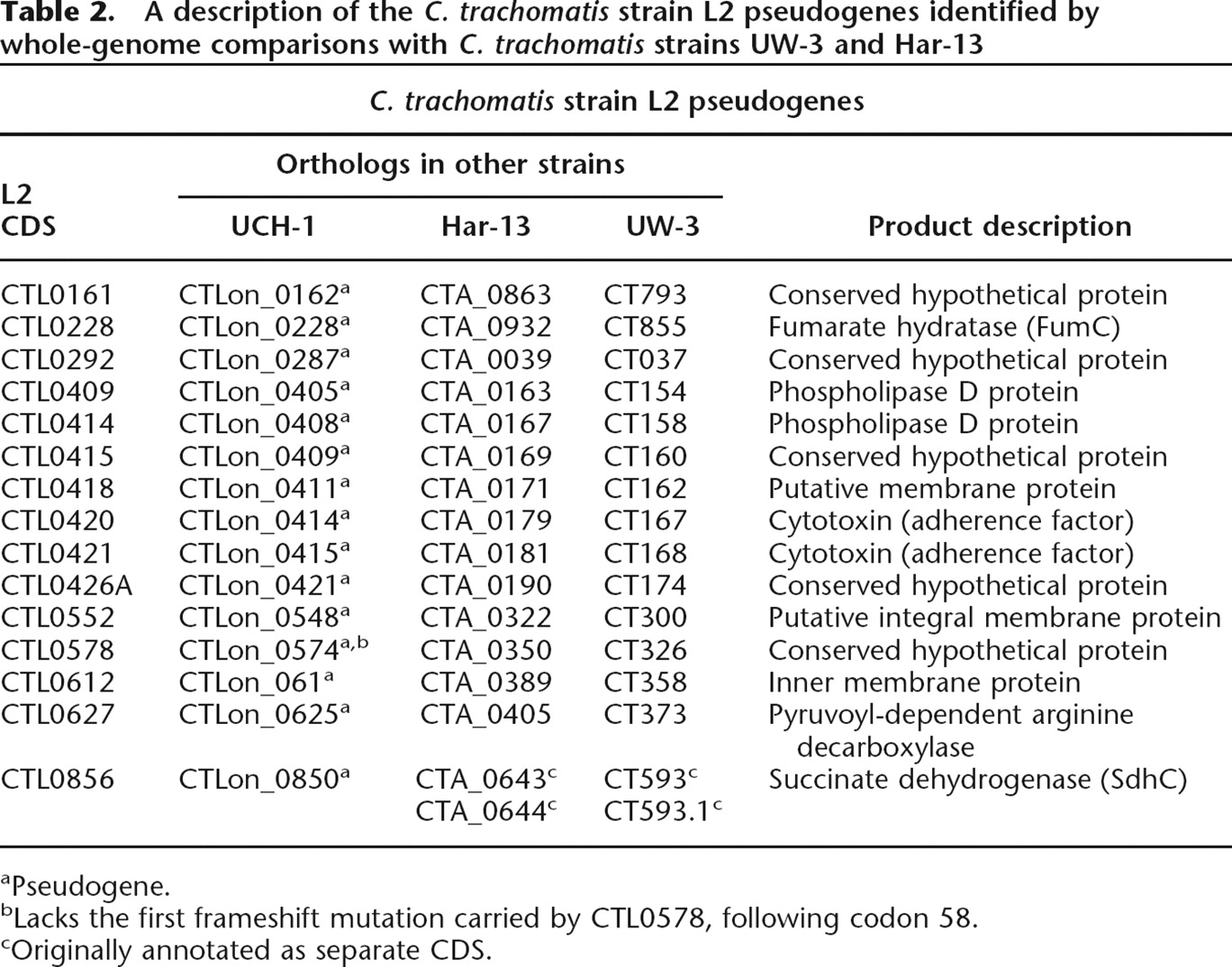 A description of the C. trachomatis strain L2 pseudogenes identified by whole-genome comparisons with C. trachomatis strains UW-3 and Har-13