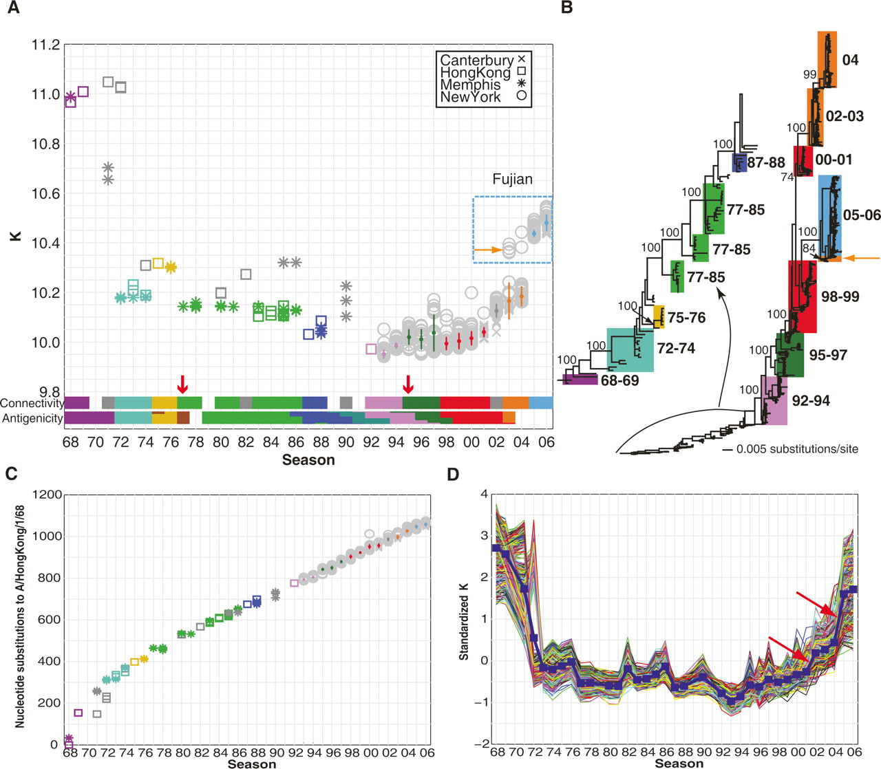 Evolving network connectivity of human influenza virus strains. (A) The average vertex connectivities (K) for each of the 1032 H3N2 nucleotide co-occurrence networks were calculated and plotted by flu season. Each marker represents one strain’s nucleotide co-occurrence network isolated from New York (circles), Memphis (asterisks), Hong Kong (squares), or Canterbury (crosses). The connectivity clusters for predominant strains (see Methods for detailed explanation of calculations) are colored according to their best-matched antigenic clusters in Smith et al’s analysis (Smith et al. 2004). The title denoted “Antigenicity” indicates the color-coded antigenic clusters in Smith’s work. (B) Phylogenetic tree derived from the concatenated viral genomes of H3N2 strains isolated between 1968 and 2006. Bootstrap values are shown for key nodes. The strains within a connectivity cluster in A are mapped to the phylogenetic tree and are shaded with the same color as the connectivity clusters. The clades are labeled using the season from which the majority of the strains were isolated. (C) Season-by-season analysis of whole-genome sequence evolution of 1032 strains. Genetic (nucleotide substitution) distances relative to A/Hong Kong/1/68 were calculated from the phylogenetic tree in B for each of the 1032 strains. The color and symbol representation are the same as in A. (D) Standardized vertex connectivities (K) for the simulated sampling of nucleotide co-occurrence networks are plotted by season. The blue line indicates the average K for all strains sampled from that season.