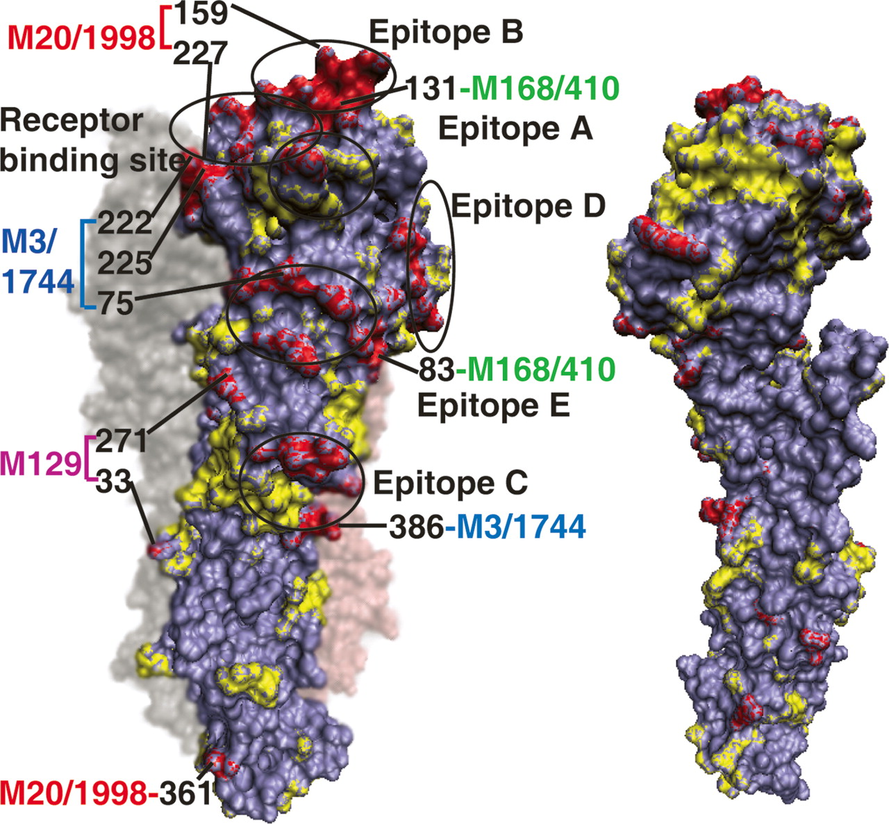 Module-based H3N2 amino acid substitutions mapped onto the HA structure. Amino acid substitutions from 1968 to 2006 are mapped onto the (left panel) exposed and (right panel) buried surface of the HA monomer. Residues are colored by module-based amino acid changes (red), non-module-based changes (yellow), and intact residues (purple). The five antibody epitopes (Wiley et al. 1981) and the receptor-binding site (Skehel and Wiley 2000) are circled. The module-based amino acid substitutions carrying two or more residues in 1998–2006 are labeled.