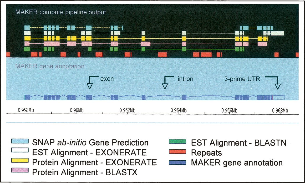Apollo view of a MAKER gene annotation and its associated evidence. Evidence gathered by MAKER’s compute pipeline (upper panel) is synthesized into the resulting MAKER annotation (lower panel).