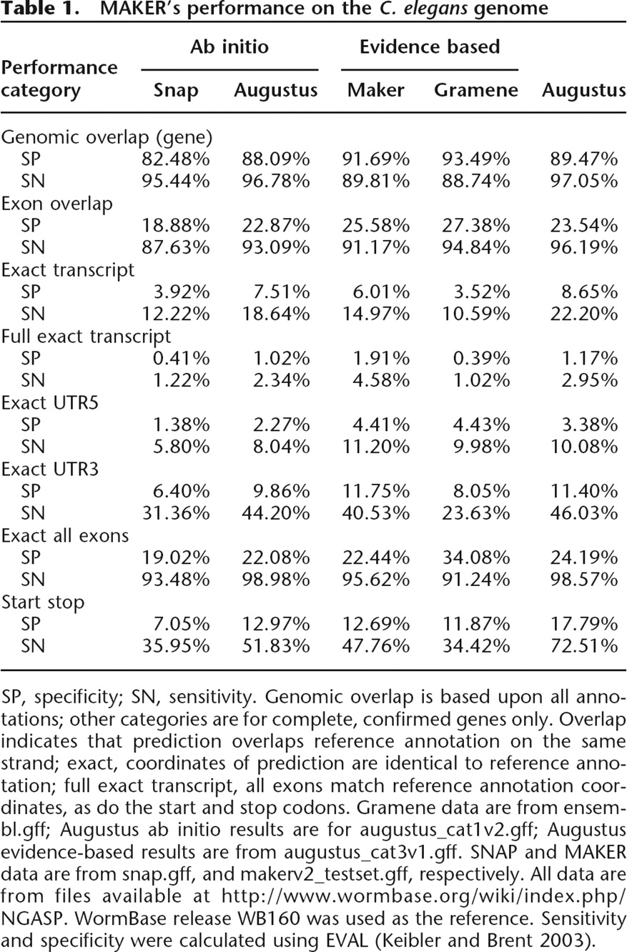 SP, specificity; SN, sensitivity. Genomic overlap is based upon all annotations; other categories are for complete, confirmed genes only. Overlap indicates that prediction overlaps reference annotation on the same strand; exact, coordinates of prediction are identical to reference annotation; full exact transcript, all exons match reference annotation coordinates, as do the start and stop codons. Gramene data are from ensembl.gff; Augustus ab initio results are for augustus_cat1v2.gff; Augustus evidence-based results are from augustus_cat3v1.gff. SNAP and MAKER data are from snap.gff, and makerv2_testset.gff, respectively. All data are from files available at http://www.wormbase.org/wiki/index.php/NGASP. WormBase release WB160 was used as the reference. Sensitivity and specificity were calculated using EVAL (Keibler and Brent 2003).
