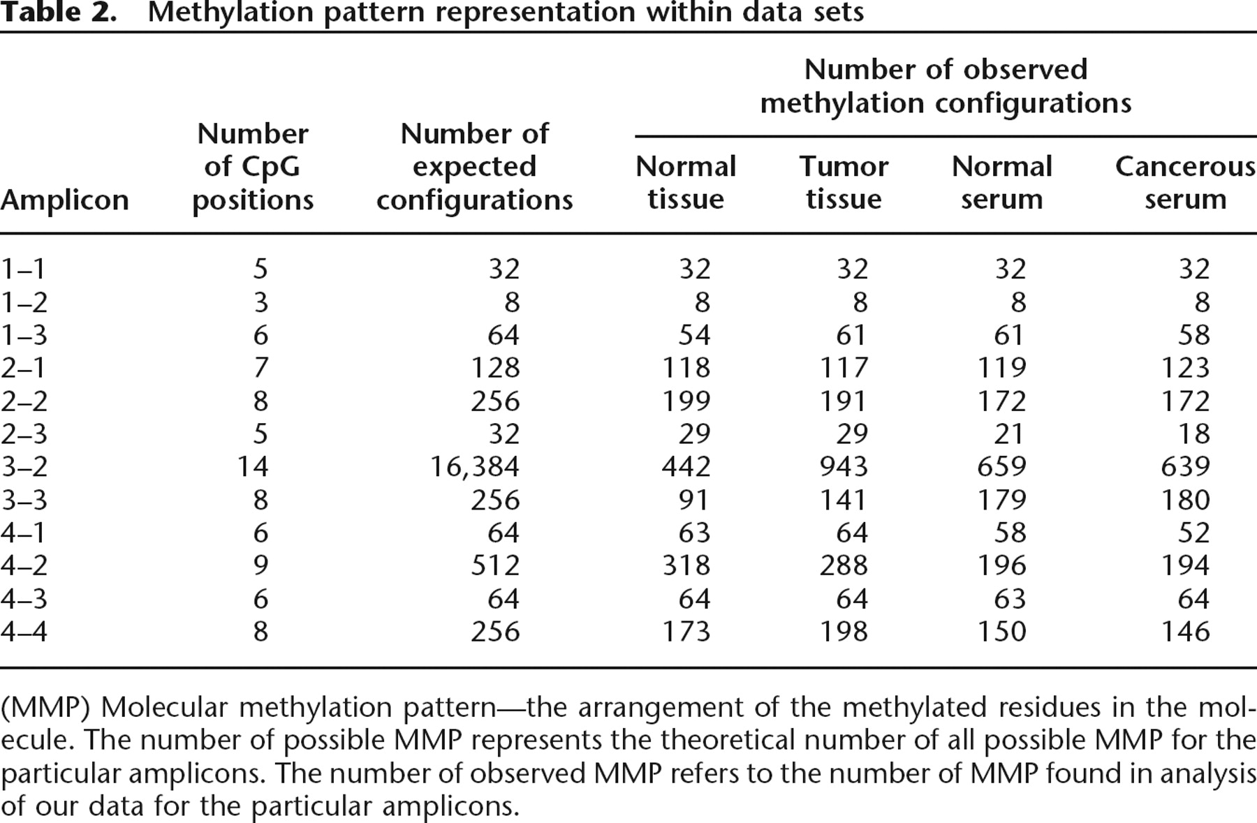 (MMP) Molecular methylation pattern—the arrangement of the methylated residues in the molecule. The number of possible MMP represents the theoretical number of all possible MMP for the particular amplicons. The number of observed MMP refers to the number of MMP found in analysis of our data for the particular amplicons.