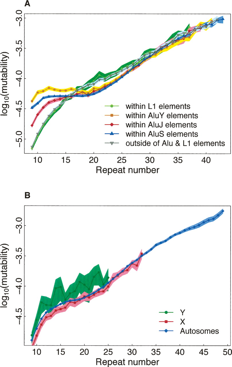 Dependence of mononucleotide microsatellite mutability on location inside vs. outside of interspersed repetitive elements (A; AluY, AluJ, AluS, and LINEs) and chromosome type (B; X, Y, or autosomes). See description of Figure 1.