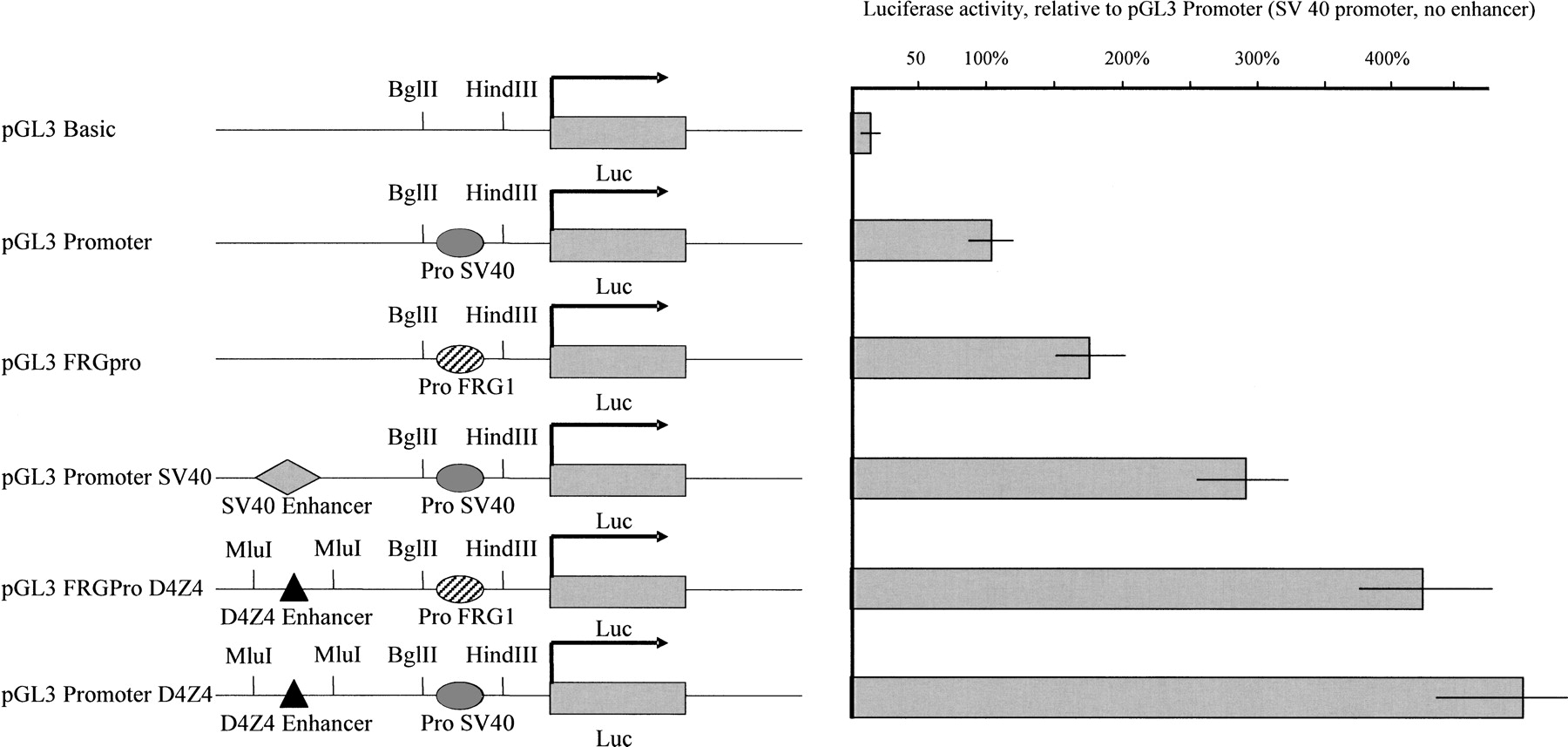 The D4Z4 minimal enhancer up-regulates transcription from the FRG1 promoter. The effect of various promoter/enhancer combinations was observed 48 h after transfection. The luciferase activity is shown relative to that obtained with the pGL3 promoter plasmid carrying the SV40 promoter. The SV40 and FRG1 gene promoters are shown as plain and streaked gray ovals, respectively. The SV40 and D4Z4 enhancers are represented with a diamond and triangle, respectively. Luc stands for luciferase reporter gene.