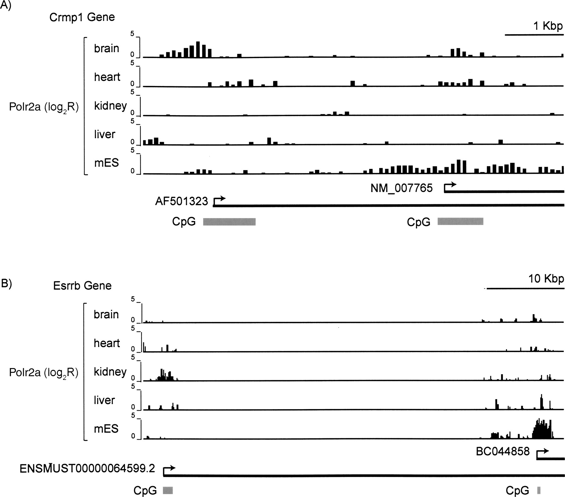 Polr2a binding profiles reveal alternative promoters usage across tissues. (A) ChIP-chip profiles for Polr2a spanning two alternative promoters for the Crmp1 gene. Each bar represents Polr2a ChIP-chip log2 ratio corresponding to a 50-bp probe. These probes are distributed along the genomic regions at 100-bp end-to-end spacing. (B) Similar Polr2a binding profile for the two alternative promoters of the Esrrb gene.