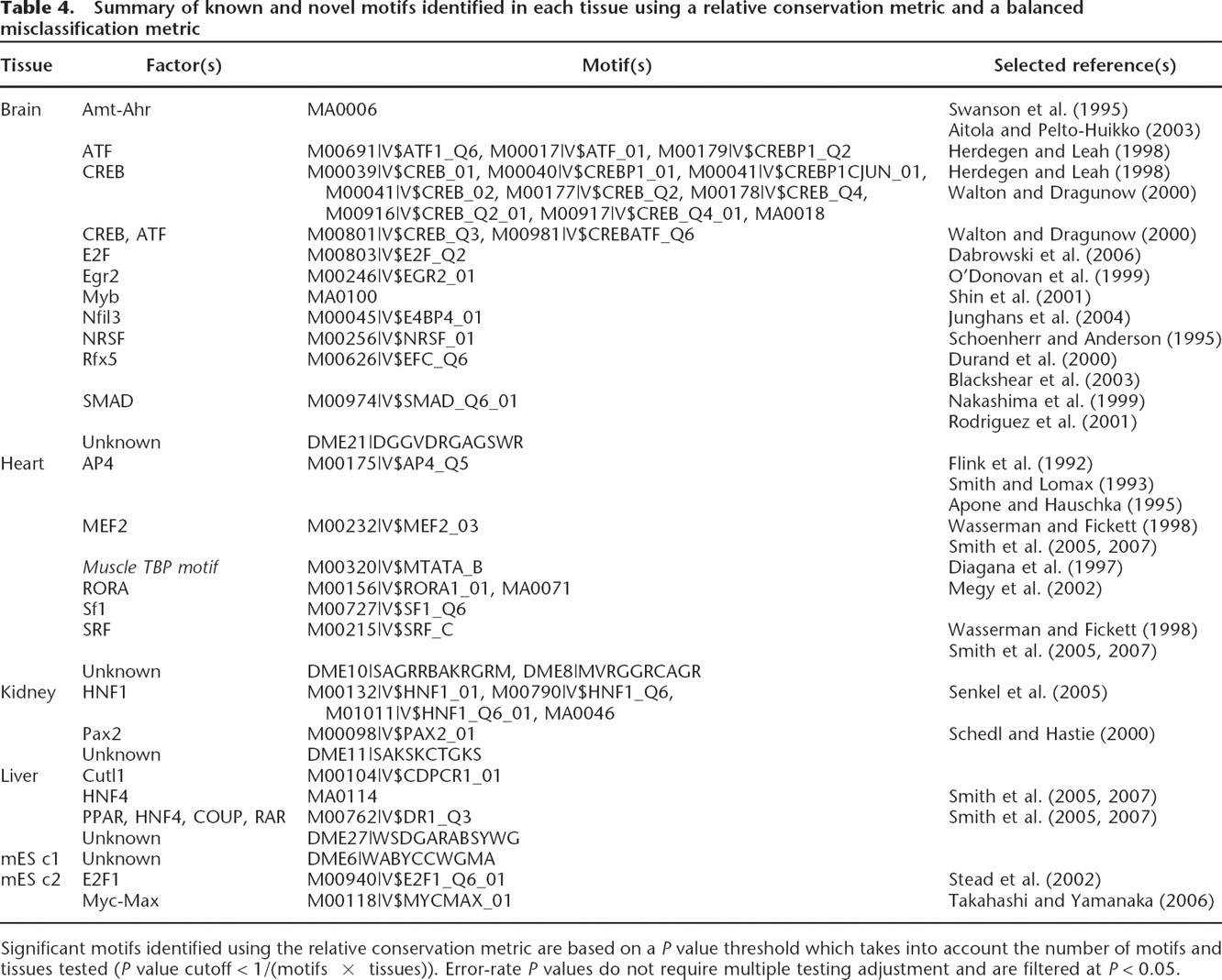 Summary of known and novel motifs identified in each tissue using a relative conservation metric and a balanced misclassification metric