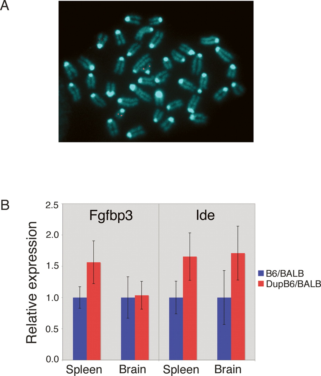 Multiple copies of chromosome 19 CNVs are tightly linked and result in altered gene expression. (A) FISH using a fosmid clone from the region hybridized to metaphase spreads from a DupB6/BALB F1 animal. Signal observed in the four chromatids of two homologous chromosomes corresponds to a single location on mouse chromosome 19. (B) Fgfbp3 and Ide expression are increased in animals carrying gene duplications. Expression of Fgfbp3 is significantly (P < 0.001) increased in spleen, but not affected in brain. Expression of Ide is significantly increased in both spleen (P < 0.001) and brain (P < 0.01). The graph depicts the mean±one standard deviation for data from four to six replicates from each of seven to eight animals in each group.