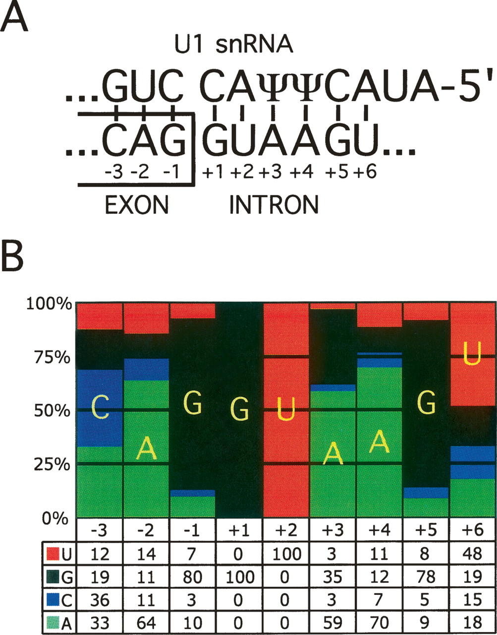 Features of the 5′ splice site (5′ss). (A) Base pairing between the 5′ end of the U1 snRNA and the consensus 5′ss sequence. ψ denotes pseudo-uridine, which is a modified uridine nucleotide capable of base pairing to both A and G nucleotides. The conventional numbering of positions relative to the exon–intron boundary is indicated. For example, in the text −1G refers to nucleotide G at position −1. (B) A pictorial representation of the position weight matrix (PWM) of the human U2-type GT-AG 5′ss; the bars represent the percentages of nucleotides at each position of the 5′ss. The actual percentages are shown below the representation.