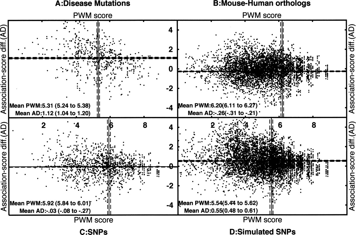 Scatter plots showing combinations of PWM scores (X-axis) and association-score differences (Y-axis) for 5′ss from four data sets. The four data sets are disease-causing mutations (A, 595 cases), orthologous mouse–human pairs of 5′ss (B, 19,940 pairs), SNPs at 5′ss (C, 1260 SNPs), and simulated SNPs at 5′ss (D, 8074 cases). Each spot in the data set corresponds to a 5′ss and a single-nucleotide change to the 5′ss. In each data set, along the X-axis, we plotted the original 5′ss PWM score; in the case of SNPs and orthologous 5′ss, the 5′ss with the higher score is considered the original 5′ss. Along the Y-axis, we plotted the difference in association scores due to the change (score of original pair − score of new pair). A change to a pair with reduced association score will give a positive score difference, and an increase in association score will give a negative value. The solid lines show the averages along the X- and Y-axes, whereas the dashed lines show the confidence intervals for the means (calculated by a bootstrap method). The numbers are also given as text within the plots, with the confidence interval shown in parentheses. The disease panel is clearly biased toward low PWM scores and greater disruption of associations, compared with the other data sets. The averages for the four data sets are well separated on the basis of the confidence intervals.