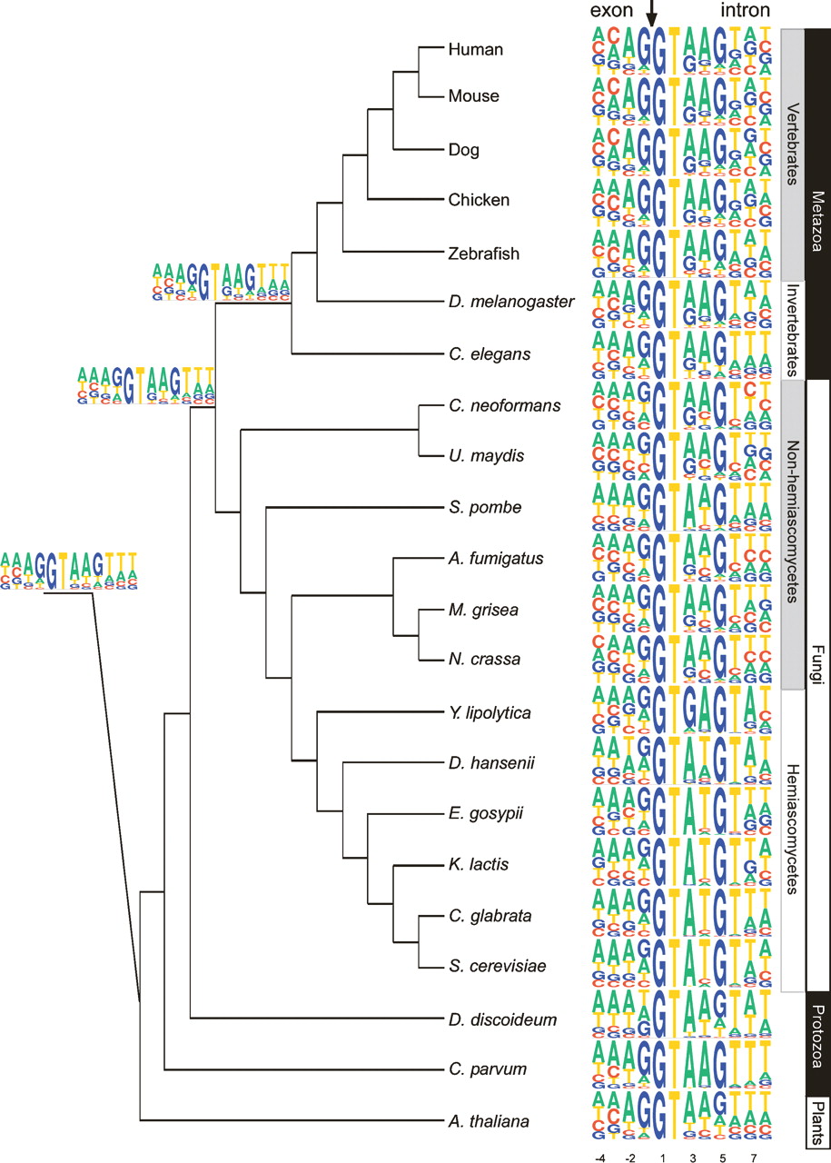 Sequence motifs of the 5′ss. The sequence motif of the 5′ss of each of the 22 organisms is displayed by using the PICTOGRAM program. The height of each letter is proportional to the frequency of the corresponding base at the given position, and bases are listed in descending order of frequency from top to bottom. The displayed sequence spans the exon-intron junction and includes the last four exonic nucleotides and the first eight intronic nucleotides (positions shown at the bottom). The arrow at the top marks the exon-intron junction. The organisms are displayed according to their phylogenetic grouping based on trees developed by Hedges (2002), Dujon (2006), and James et al. (2006). The eukaryotic kingdoms comprising these organisms, as well as phylogenetic subdivisions of these kingdoms, are plotted to the right of the sequence motifs. Sequence motifs of three major ancestral nodes, reconstructed by means of a maximum parsimony-based algorithm, are shown to the left of the tree. The top, middle, and bottom motifs represent the reconstructed sequences of the common ancestor of all metazoans, of all fungi and metazoans, and of all eukaryotes, respectively.