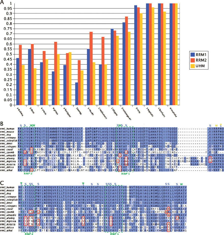 Comparative analysis of the RRM domains between U2AF2 homologs: (A) The conservation levels of the RRM domains of each organism are compared with their human counterpart. Xenopus tropicalis was used instead of chicken (see Methods). In B and C a conservation analysis of key residues in the RRM1 and RRM2 domains, respectively, is presented. These residues have been shown to be required for PPT binding in human (Sickmier et al. 2006). Residues labeled by “W” interact with the RNA through a water molecule, whereas residues labeled by “S” and “M” interact through the side-chain and main-chain, respectively. The dashed green boxes highlight the RNP1 and RNP2 motifs and the red boxes mark substitutions, with respect to metazoans, that change the biochemical properties in key residues that are responsible for RNA binding. In fungi, the following substitutions, with respect to human, can be observed: aromatic residues (F and Y) by nonaromatic ones (V, I, L, M, C, S) in the RNP1 and RNP2 regions of both RRMs. In the RRM1, polar to nonpolar substitutions: K to G at RNP1 and N to G in the RNP1 and RNP2; and polar basic (K) to nonpolar neutral (A) and polar acidic (E) at the C-terminal region (panel B). Similarly, in RRM2 of fungi we observed substitutions of a nonpolar residue (G) to polar ones (T and S) in the RNP2; polar to nonpolar substitutions: N to V, L, A near the RNP motifs, and Q to V at the C-terminal region; and basic to neutral (K to N, A) at the C-terminal region. In the RRM1 of A. thaliana there is a polar (N) to nonpolar (G) substitution in the RNP2 and a neutral (N) to basic (K) substitution in the RNP1. In the RRM1 of D. discoideum there is a substitution N to C, which reduces the polarity at this position. Finally, in the RRM2 of both species, there is a basic (K) to neutral (T) substitution in the C-terminal region.