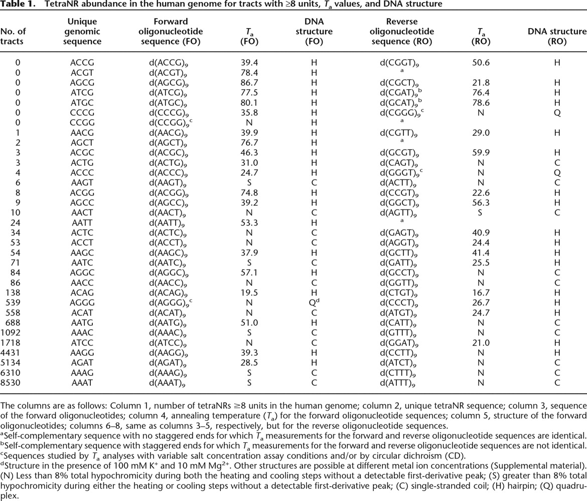 The columns are as follows: Column 1, number of tetraNRs ≥8 units in the human genome; column 2, unique tetraNR sequence; column 3, sequence of the forward oligonucleotides; column 4, annealing temperature (Ta) for the forward oligonucleotide sequences; column 5, structure of the forward oligonucleotides; columns 6–8, same as columns 3–5, respectively, but for the reverse oligonucleotide sequences.