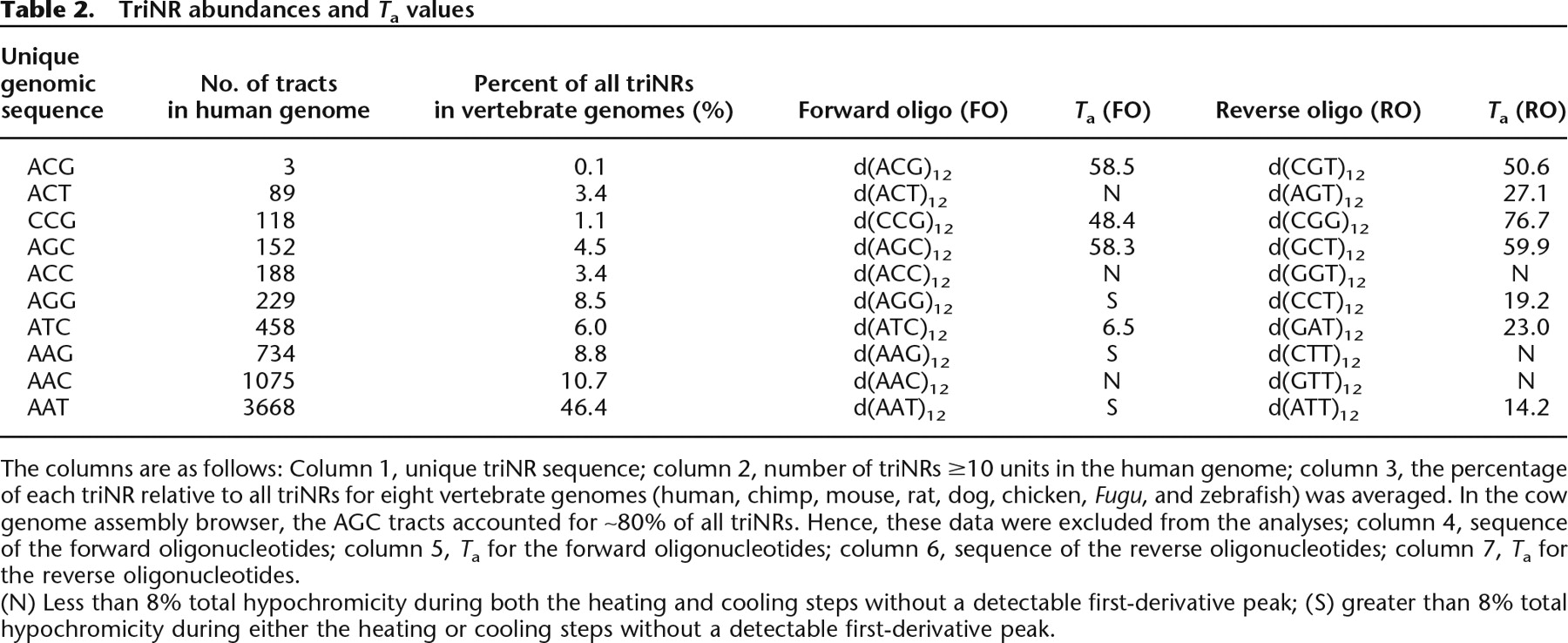 The columns are as follows: Column 1, unique triNR sequence; column 2, number of triNRs ≥10 units in the human genome; column 3, the percentage of each triNR relative to all triNRs for eight vertebrate genomes (human, chimp, mouse, rat, dog, chicken, Fugu, and zebrafish) was averaged. In the cow genome assembly browser, the AGC tracts accounted for ∼80% of all triNRs. Hence, these data were excluded from the analyses; column 4, sequence of the forward oligonucleotides; column 5, Ta for the forward oligonucleotides; column 6, sequence of the reverse oligonucleotides; column 7, Ta for the reverse oligonucleotides.