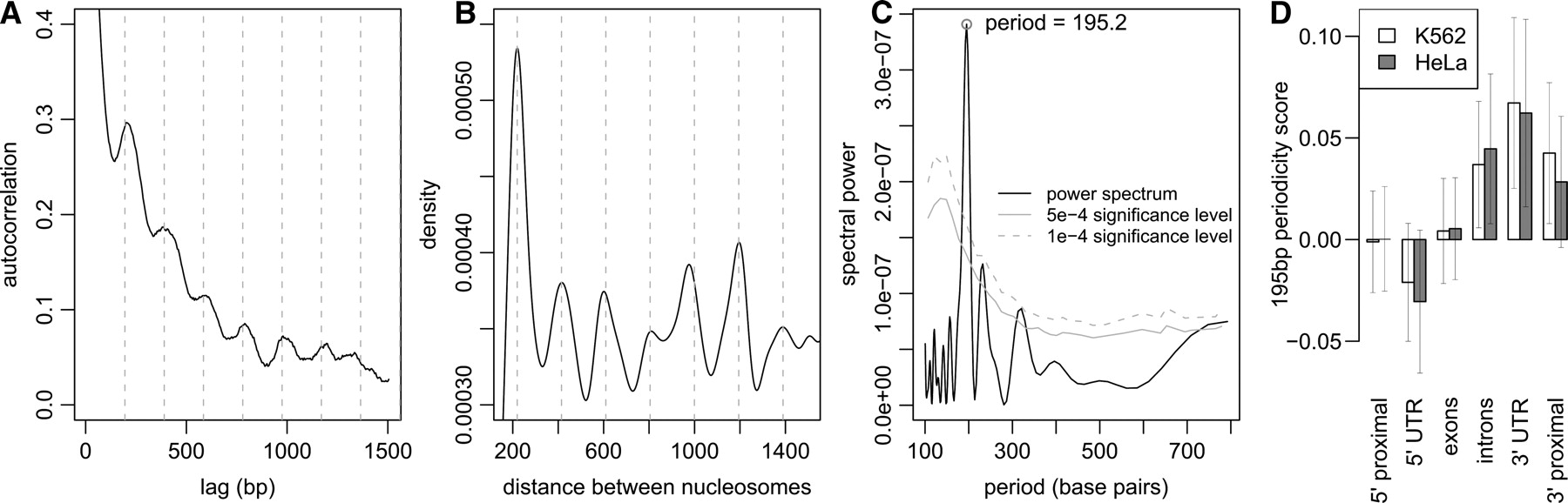 Fixed nucleosomes are organized into regular periodic arrays. (A) Autocorrelation function of the average pre-extracted chromatin profiles in K562 cells. (Dashed vertical lines) Locations of secondary peaks, spaced 195 bp apart. This demonstrates presence of pronounced 195-bp periodicity in the chromatin profiles. (B) Distribution of distances between identified fixed nucleosome positions is shown for nucleosomes 10 or fewer nucleosomes away from each other. The distance distribution clearly shows preferred internucleosomal distances that are multiples of 195 bp. (C) Fourier frequency decomposition of the nucleosome distance distribution confirming periodicity peak of 195 ± 7 bp in nucleosome positions. (Gray lines) Statistical significance levels of spectral power based on random positioning of nucleosomes in the tiled regions. (D) Mean 195-bp periodicity scores for different genomic elements. The periodic nucleosome arrays are preferentially localized near the 3′ regions of annotated genes. The periodicity scores at 3′ UTR regions are on average significantly higher than scores at the 5′ proximal, 5′ UTR, and exonic regions (t-test P-values < 4.1 × 10−3, 6.2 × 10−4, 7.5 × 10−3, respectively, in K562; 0.013, 0.0013, 0.019 in HeLa). The proximal regions are defined as 2-kb segments upstream and downstream of the annotated gene boundaries. The periodicity score is calculated using local autocorrelation (see Methods).