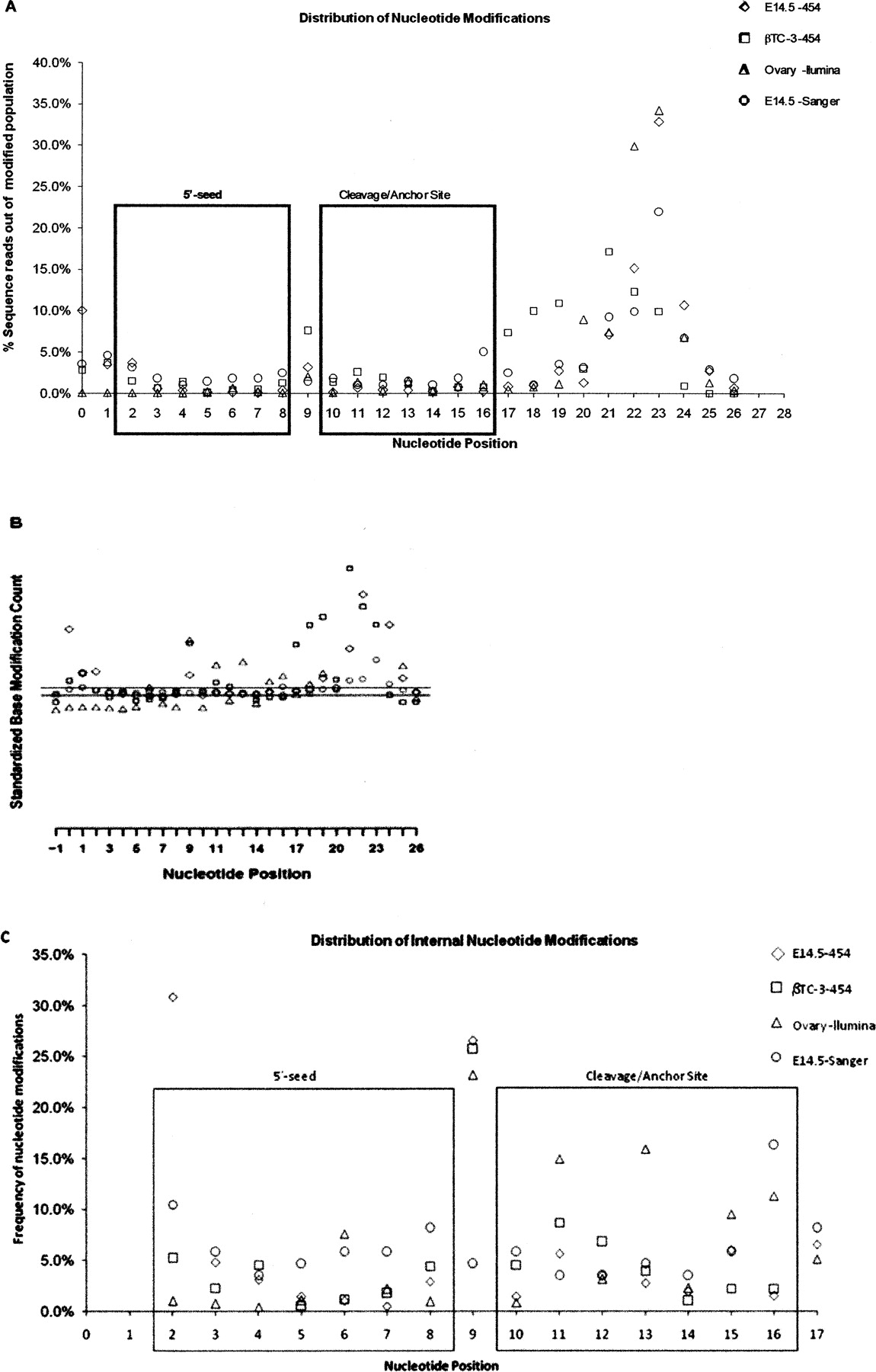(A) Relative distribution of nucleotide modifications associated with mature miRNAs in relation to nucleotide position. This panel shows the distribution of nucleotide changes along the length of the mature miRNA. Modifications are highly suppressed in nucleotides 2–8 (containing the seed region that is important for miRNA–mRNA binding) and nucleotides 10–15 possibly defining additional determinants in the miRNA–mRNA binding. In sharp contrast, modifications are frequent at nucleotide 9 and the 3′ regions (nucleotides 16 and above). From these analyses we see that nucleotide positions 3–7 in the 5′-seed and nucleotides 10–15 exhibit significant suppression from nucleotide modification. (B) Statistical test for nucleotide modification distribution. This panel shows results from a statistical test used to examine the nature of nucleotide distribution in relation to nucleotide position of the mature miRNA. The method used is described in Methods. Under the null hypothesis where all positions behave the same with respect to base modification, we expect a random distribution of nucleotide modifications in relation to position. In this model we expect this quantity to be approximately normally distributed with a mean of 0 and standard deviation of 1. To ensure a simple plot, the median Z-score across all positions was set to 0 for each sample. The two black horizontal lines delineate the standard deviation around the Z-score. All data points above the upper line reflect modifications that occur at a rate greater than expected by chance. All data points below the lower line reflect modifications that occur at a rate less than expected by chance. From the data presented in this figure we see that the 5′-seed nucleotides 3–7, cleavage site nucleotide 10, and anchor nucleotides 14, 15 are constrained. Nucleotide position 9 is the most enriched internal position for modifications. (C) Relative distribution of internal nucleotide modifications. This panel shows the distribution of nucleotide changes in relation to internal positions (nucleotides 2–17). Modifications are highly suppressed in nucleotides 2–8 (containing the seed region that is important for miRNA–mRNA binding) and nucleotides 10–15 possibly defining additional determinants in the miRNA–mRNA binding. In sharp contrast, modifications are frequent at nucleotide 9 and the 3′-regions (nucleotides 16 and above). From these analyses we see that nucleotide positions 3–7 in the 5′-seed and nucleotides 10–15 exhibit significant suppression from nucleotide modification.