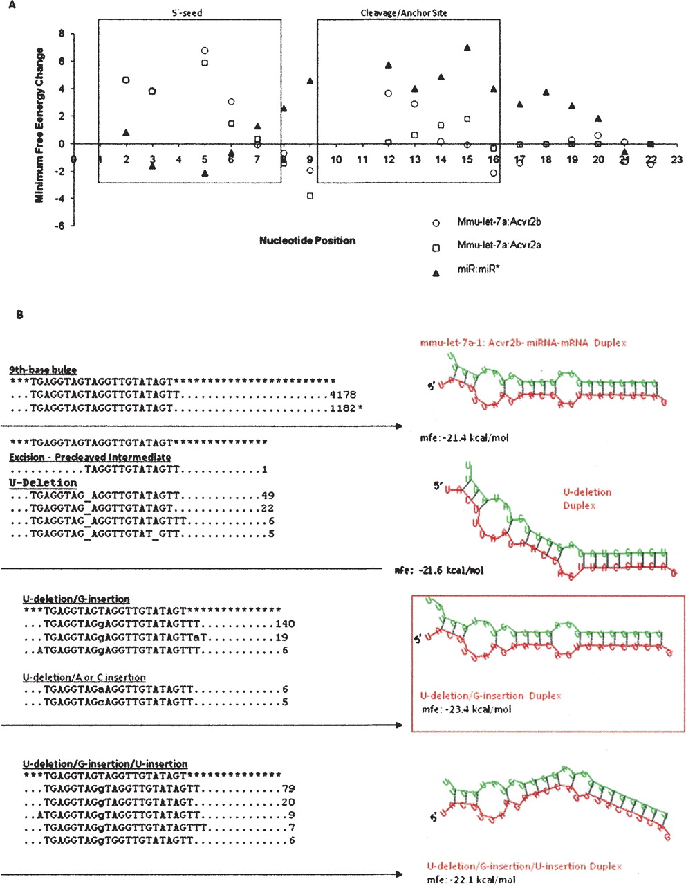 (A) Impact of internal modifications on the let-7a-1:Acvr2a/b duplexes. This panel summarizes the average minimum free energy change (Δmfe) that results from the full set of nucleotide edits at that position. The complete data that were used to compute the averages can be found in Supplemental Table ST11A,B. Here we see that modifications in the duplexed regions (nucleotides 2–8, 10–15) are rare and result in a net increase in mfe and decrease in stability. In contrast, nucleotide edits in bulge regions, including nucleotide positions 9 and 16 and above, result in a net decrease in mfe and increase in stability. In contrast, we see an increase in mfe at the ninth position in the miR:miR* duplex. We do not observe any edits for positions 4, 10, or 11 in mmu-let-7a, and hence these positions do not have associated values in the graph. (B) Intermediates and final products of ninth nucleotide edits associated with the mmu-let-7a-1:Acvr2. This panel shows the minimum free energy and secondary structure of let-7a-1 species that possibly represent intermediates and end products of a U-deletion/insertion reaction. Edited sequences with copy numbers denoted at the end of the dotted line and the wild-type unedited miRNA denoted by an * are shown on the left panel. We find sequences that are consistent with excision intermediates, U-deletion products following religation, U-deletion/G-insertion products, and U-deletion/G-insertion/U-insertion products. All of these products exhibit a lower duplex mfe than the mature miRNA without edits (mfe = −21.4 kcal/mol). The U-deletion/G-insertion product that occurs at the highest copy number is also the most stable, with an mfe of −23.4 kcal/mol.