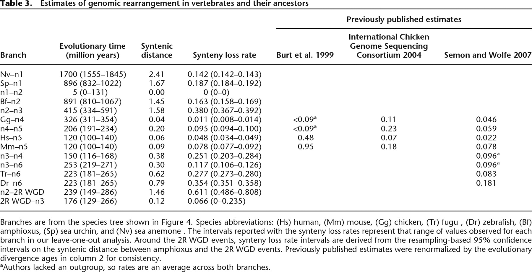 Branches are from the species tree shown in Figure 4. Species abbreviations: (Hs) human, (Mm) mouse, (Gg) chicken, (Tr) fugu , (Dr) zebrafish, (Bf) amphioxus, (Sp) sea urchin, and (Nv) sea anemone. The intervals reported with the synteny loss rates represent that range of values observed for each branch in our leave-one-out analysis. Around the 2R WGD events, synteny loss rate intervals are derived from the resampling-based 95% confidence intervals on the syntenic distance between amphioxus and the 2R WGD events. Previously published estimates were renormalized by the evolutionary divergence ages in column 2 for consistency.