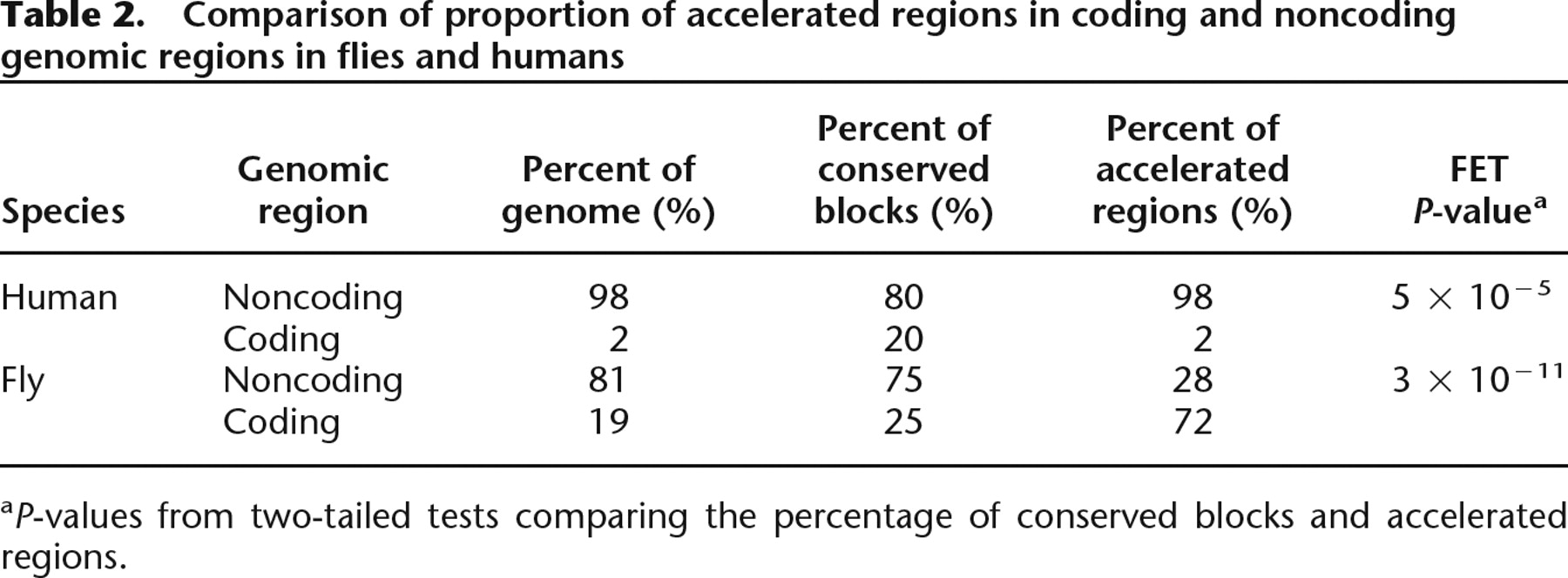 Comparison of proportion of accelerated regions in coding and noncoding genomic regions in flies and humans