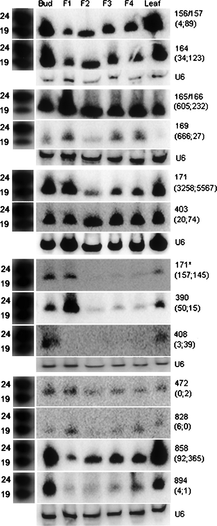 Expression of conserved tomato miRNAs. Total RNA from different tissues was extracted, separated, and transferred to membranes. The membranes were hybridized to miRNA-specific probes or a U6-specific probe (shown on the right) to demonstrate equal loading. Membranes were stripped and reprobed; equal loading is shown once for each membrane. Numbers between brackets indicate the number of sequences found in the fruit (left) and leaf (right) libraries for each miRNA. Different size fruits were used for RNA extraction: F1, 1–3 mm; F2, 5–7 mm; F3, 7–11 mm; F4, 11–14 mm. Size markers on the left are 24- and 19-nt RNA oligonucleotides.