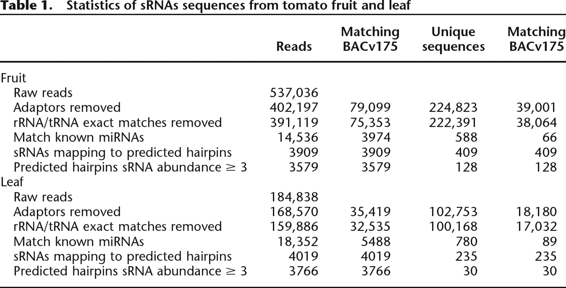 Statistics of sRNAs sequences from tomato fruit and leaf
