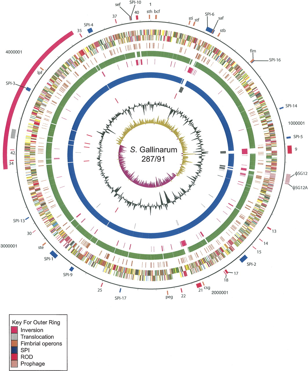 Circular representation of the S. Gallinarum 287/91 chromosome. For a full description of this figure, see legend to Figure 2. The exception is that circle 5 shows the position of S. Gallinarum 287/91 pseudogenes. Circles 6 and 8 show the position of S. Gallinarum 287/91 genes which have orthologs (by reciprocal FASTA analysis) in S. Typhimurium LT2 (all CDS colored green) or S. Enteritidis PT4 (all CDS colored blue), respectively. Circles 7 and 9 show the position of S. Gallinarum 287/91 genes that lack orthologs in (by reciprocal FASTA analysis) in S. Typhimurium strain LT2 (all CDS colored pink) and S. Enteritidis PT4 (all CDS colored gray), respectively. Circle 10 shows the position of the S. Gallinarum 287/91 rRNA operons (red).