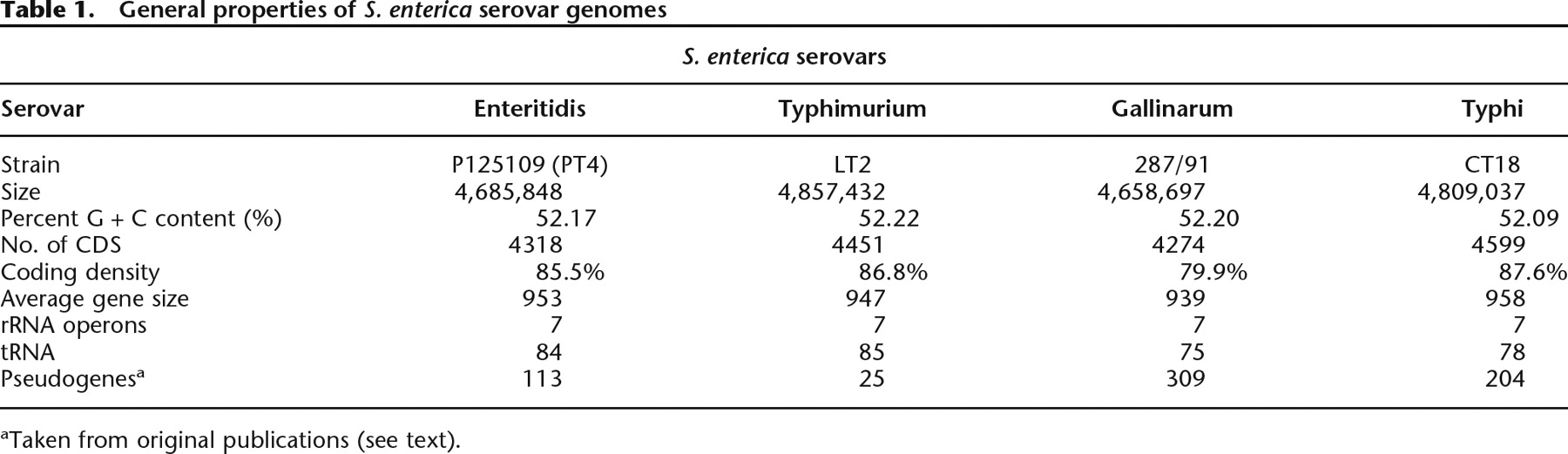 General properties of S. enterica serovar genomes