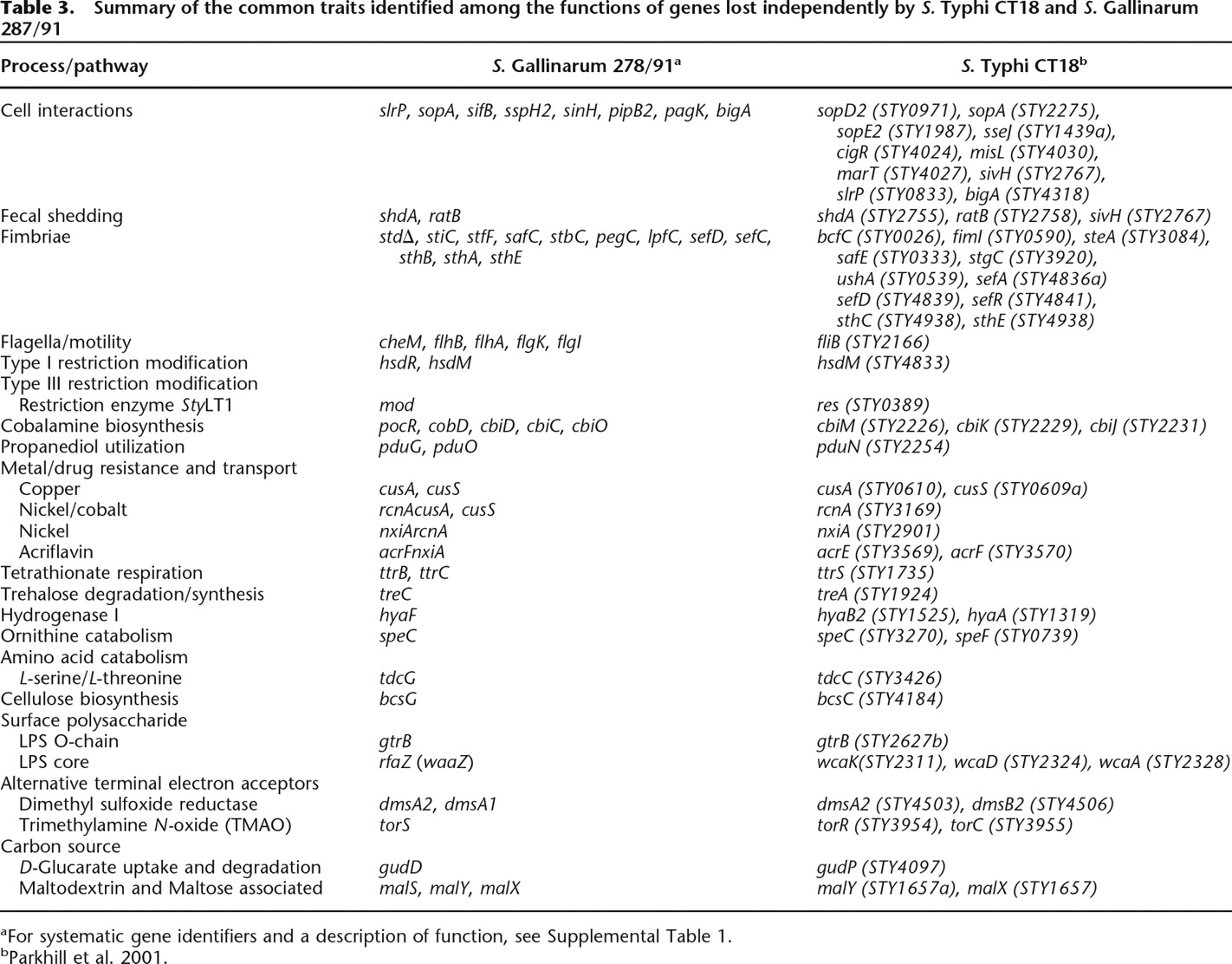 Summary of the common traits identified among the functions of genes lost independently by S. Typhi CT18 and S. Gallinarum 287/91