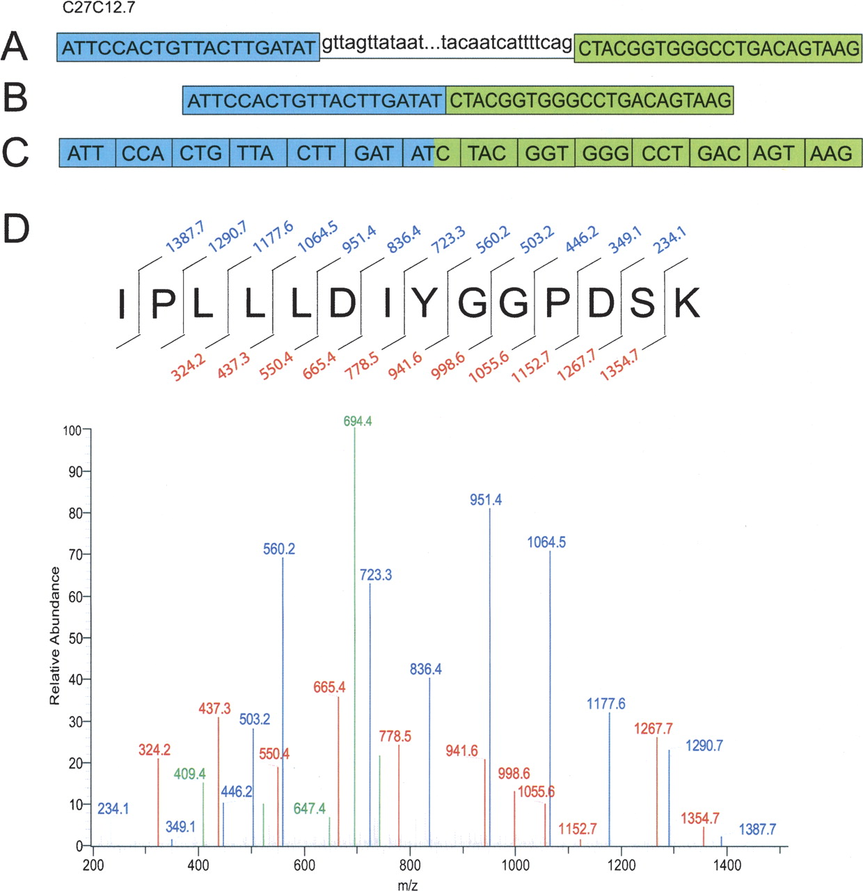 Splice junction confirmation via mass spectrometry. The confirmation of the splice junction between exon 10 (in blue) and exon 11 (in green) for the C. elegans gene C27C12.7 encoding a dipeptidyl peptidase (DPF-2) is illustrated. (A) The unspliced DNA sequence of C27C12.7 between the end of exon 10 and the beginning of exon 11. (B) Exon 10 and exon 11 spliced together. (C) The spliced exons separated into codons. (D) The peptide sequence spanning the splice junction and the representative mass spectrum. The numbers in blue above the peptide sequence represent the C-terminal y-ions and the red numbers below the peptide sequence represent the N-terminal b-ions. (Blue) y-ions; (red) b-ions; (green) all other ions (a-ions, doubly charged ions, ions from the loss of water or ammonia, etc.).
