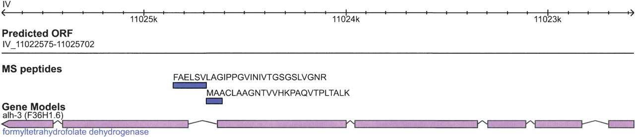 Correction of a misannotated coding sequence. The gene alh-3 (F36H1.6) contains six exons (pink) and encodes a dehydrogenase in C. elegans according to WormBase 150. We have identified two unique peptides (blue) between exons 2 and 3 that span the genomic region 11,022,575–11,025,702 on chromosome IV. Both peptides lie at least partially within an intron. This gene model has since been fixed in WS180.