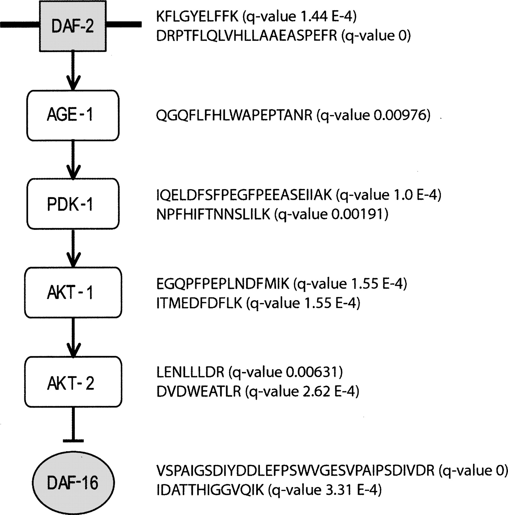 Peptides identified in the insulin/insulin-like growth factor 1 signaling pathway can be used as proteotypic peptides in future targeted analyses. Shown here are the major proteins involved in the insulin/insulin-like growth factor 1 signaling pathway along with peptides identified from the respective proteins.