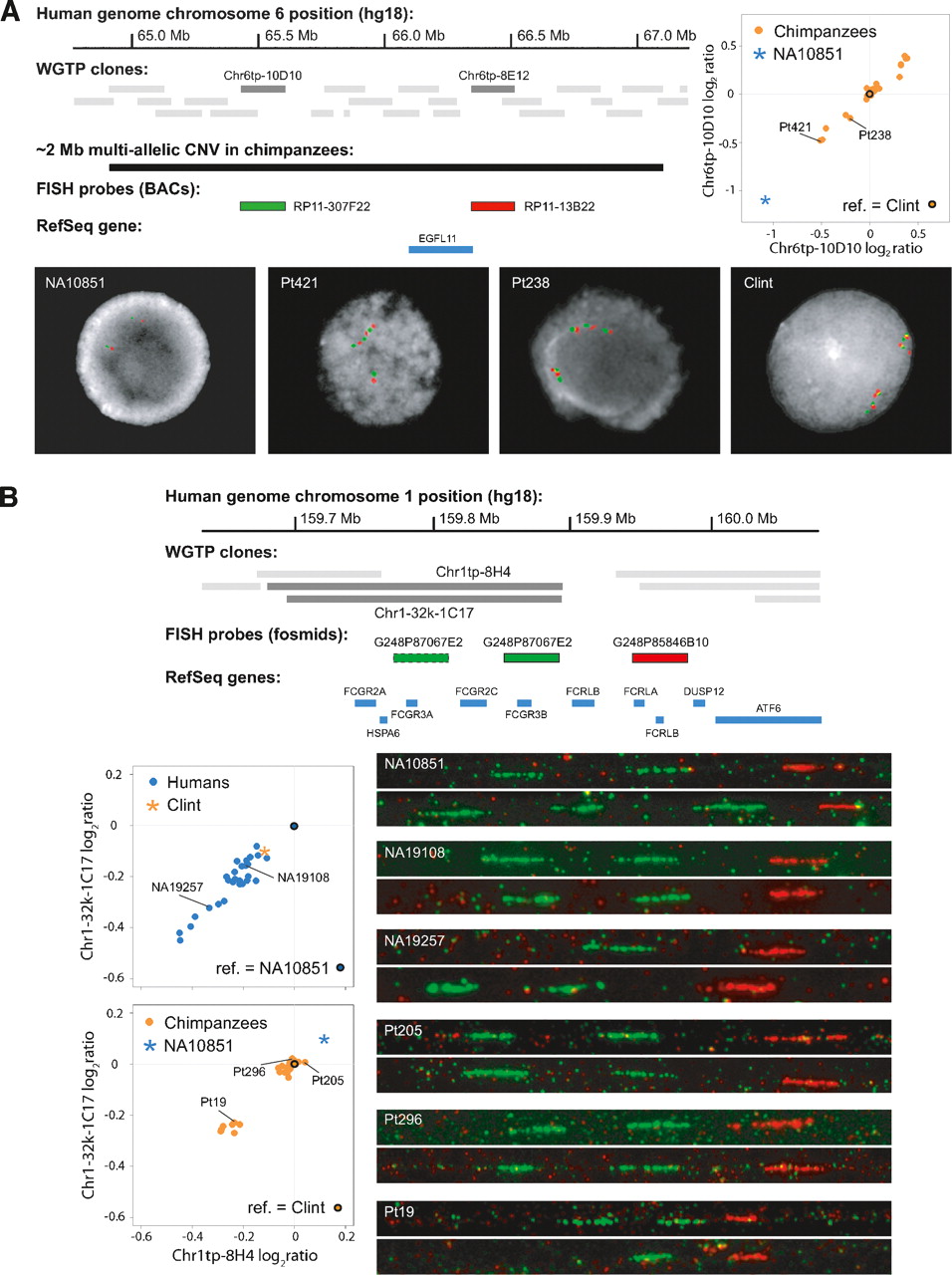 Validation of CNV loci by fluorescence in situ hybridization. (A) An ∼2-Mb region encompassing the EGFL11 gene (human chromosome region 6q12) is copy-number variable in chimpanzees. The relative intensity log2 ratios for clones throughout this region form four discrete clusters. In addition, there is a relatively large log2 ratio difference between the human and chimpanzee reference individuals (ref., reference). Interphase FISH experiments with two labeled BAC probes (RP11-307F22 in green; RP11-13B22 in red) confirmed the presence of an extremely large, tandem, multi-allelic CNV in chimpanzees. The human reference individual NA10851 was found to have two diploid copies (one copy on each chromosome). The chimpanzee log2 ratio clusters correspond to four (Pt421; 1 + 3), five (Pt238; 2 + 3), six (reference chimpanzee Clint; 3 + 3), and presumably seven copies of this genomic region per diploid cell. (B) The WGTP clones Chr1tp-8H4 and Chr1-32k-1C17 (human chromosome 1q23.3) report CNVs in both humans and chimpanzees. This region includes the FCGR2 and FCGR3 genes, and HSPA6. Fiber FISH experiments with two labeled fosmid probes (G248P87067E2 in green; G248P85846B10 in red) validated the WGTP results and determined absolute copy numbers of the FCGR3 genes, which have been associated with susceptibility to systemic autoimmune diseases (Fanciulli et al. 2007). The human reference individual NA10851 has five diploid FCGR3 copies (3 + 2), while the other humans apparently have either four (e.g., NA19108; 2 + 2) or three (e.g., NA19257; 2 + 1) copies per diploid cell. Chimpanzees have either four (Pt205 and Pt296; 2 + 2) or three (Pt19; 2 + 1) diploid copies of this genomic region.