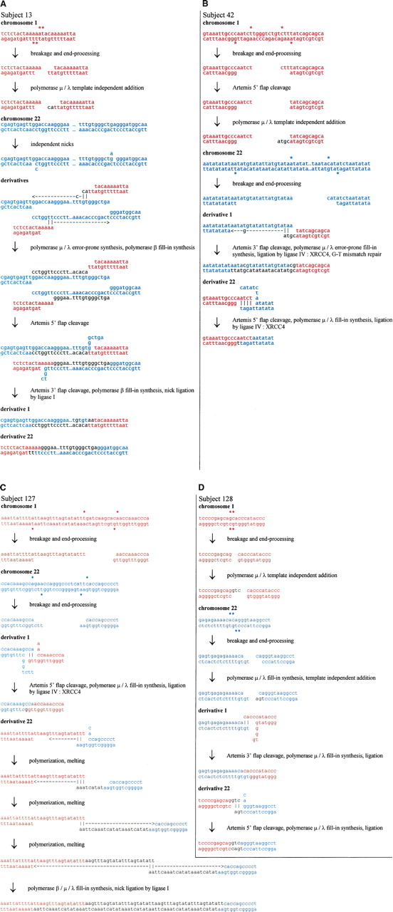 Possible NHEJ scenarios for four balanced translocations t(1;22)(p36;q13). Sequences presented in red and blue correspond to chromosome 1 and 22 sequence, respectively. (A) Scenario for subject 13. A DSB on chromosome 1 results in a pair of 3′ overhangs—ends with unpaired bases on the 3′ strand. These overhangs invade into separate nicks on chromosome 22 that have opened a little. Polymerase μ or λ polymerizes a few bases on one of the ends, template-independently, and this finds some homology in one of the opened nicks. The polymerase then adds template-dependently, accidentally creating a T–C mismatch in the process. Polymerase β (POLB) fills in the gap. The other 3′ overhang has some microhomology with the other nick on chromosome 22, and polymerase μ or λ polymerizes a few bases template-dependently before ceding to polymerase β. The polymerases continue until they reach the original position of the other nick, and the original chromosome 22 DNA strands are separated along the way. The remaining flaps from the microhomology search are cleaved by ARTEMIS and the nicks sealed by ligase I. The result is a long duplication of chromosome 22 sequence. (B) Scenario for subject 42. A DSB on chromosome 22 results in a 3′ overhang end—an end with unpaired bases on the 3′ strand—and a 5′ overhang end—an end with unpaired bases on the 5′ strand. Chromosome 1 also has a DSB which results in a 3′ overhang end and a 5′ overhang end. The 5′ overhang end is resected by ARTEMIS and extended by polymerase μ or λ template-independently, creating a 3′ overhang end. This end has some microhomology with the 3′ overhang end of chromosome 22, and the microhomology is extended by polymerase μ or λ, which accidently polymerizes a G–T mismatch during the process. The mismatch is aberrantly repaired, resulting in a one-base mutation. The remaining 3′ overhang end of chromosome 1 has some microhomology in the 5′ overhang end of chromosome 22 after some opening. Any remaining flaps are cleaved by ARTEMIS, single-stranded DNA gaps are filled by polymerase μ or λ, and nicks are sealed by ligase IV:XRCC4. (C) Scenario for subject 127. A DSB on chromosome 1 generates two 3′ overhang ends—ends with unpaired bases on the 3′ strand—while a DSB on chromosome 22 results in a 3′ overhang end and a 5′ overhang end. One of the chromosome 1 ends has some microhomology with the 3′ overhang end from chromosome 22 after it has opened a little. The 5′ flaps are resected by ARTEMIS and the single-stranded DNA gaps filled by polymerase μ or λ and sealed by ligase IV:XRCC4. The remaining chromosome 1 3′ overhang end has some microhomology on the remaining chromosome 22 end, which is extended by polymerase μ or λ. The ends undergo several rounds of melting and microhomology-mediated polymerization. Any remaining single-stranded DNA gaps are filled by polymerases μ or λ and β, and the nicks sealed by ligase IV:XRCC4 or ligase I. (D) Scenario for subject 128. A DSB on chromosome 1 results in two blunt ends, one of which is extended template-independently by polymerase μ or λ to result in a 3′ overhang end. Another DSB on chromosome 22 results in two 5′ overhang ends. One of these ends is filled template-dependently by polymerase μ or λ, and then an extra base added template-independently, resulting in a 3′ overhang end. The 5′ overhang end of chromosome 22 has some microhomology with the 5′ overhang of chromosome 1 after both have opened a little. The 5′ flap is cleaved by ARTEMIS, the single-stranded DNA gaps filled by polymerase μ or λ, and the nicks sealed by ligase IV:XRCC4. The remaining chromosome 1 3′ overhang end has some microhomology with the remaining chromosome 22 5′ overhang end after it has opened, and the flap cleavage, gap-filling, and sealing proceed as before.