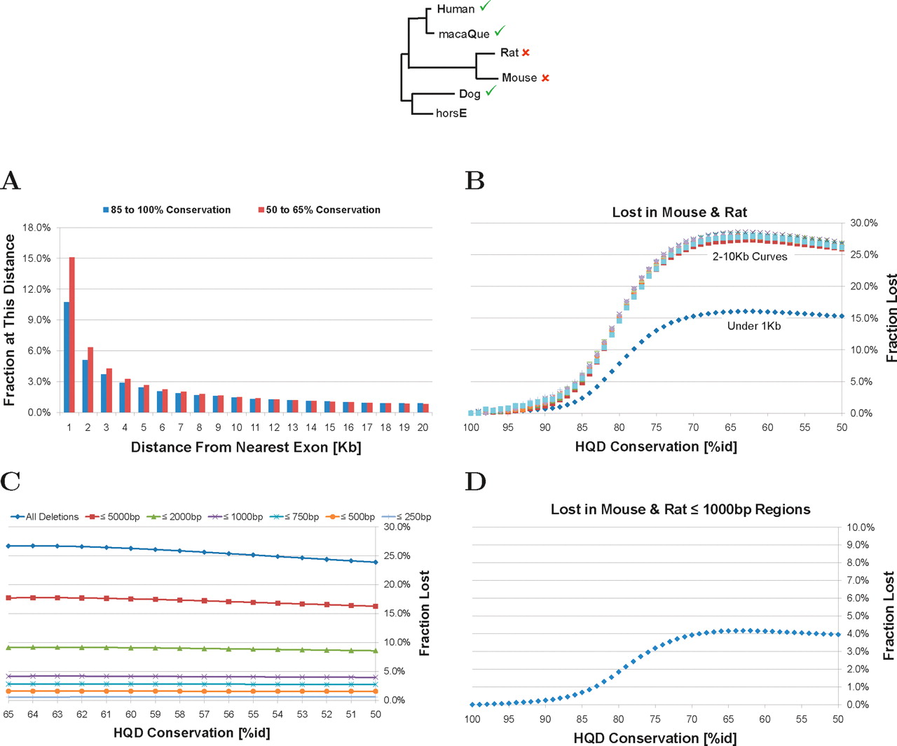 Relationship of neutrally-evolving mammalian DNA loss rates to mammalian genome structure. (A) Fraction of conserved nonexonic primate-dog elements as a function of distance from nearest exon. (B) Rodent-specific loss rate of nonexonic elements as a function of distance from the nearest exon. Elements within 1 kb of the nearest exon are markedly less likely to be lost at all conservation levels. (C) Rodent-specific loss rate of low-conservation nonexonic regions as a function of lost region size. (D) Rodent-specific loss rate of nonexonic regions at most 1000 bp in size.