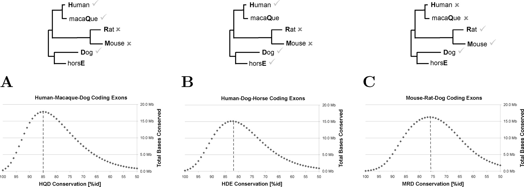Abundance of coding exon sequences for all three alignment topologies. (A) Abundance of primate-dog coding exon DNA. (B) Abundance of human-dog-horse coding exon DNA. (C) Abundance of rodent-dog coding exon DNA.