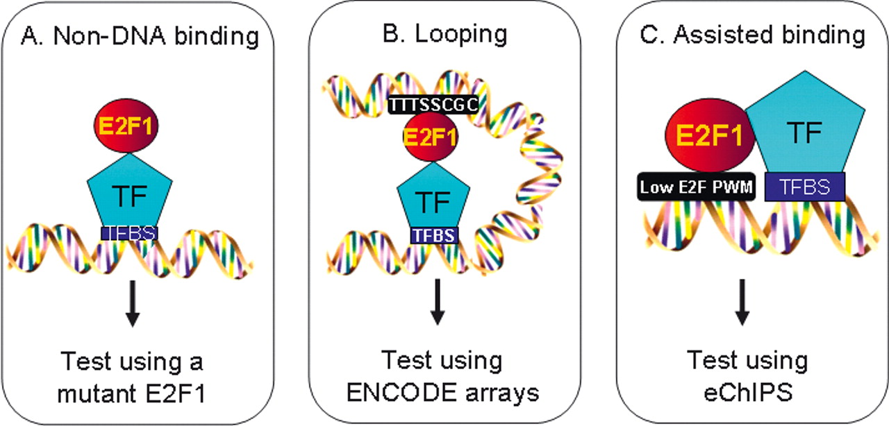 Models for recruitment of E2F1 to promoters that lack a consensus motif. Shown are schematics representing potential modes of E2F1 recruitment via a mechanism independent of its DNA binding domain (A), via looping (B), or via stabilized binding in cooperation with another transcription factor (C).
