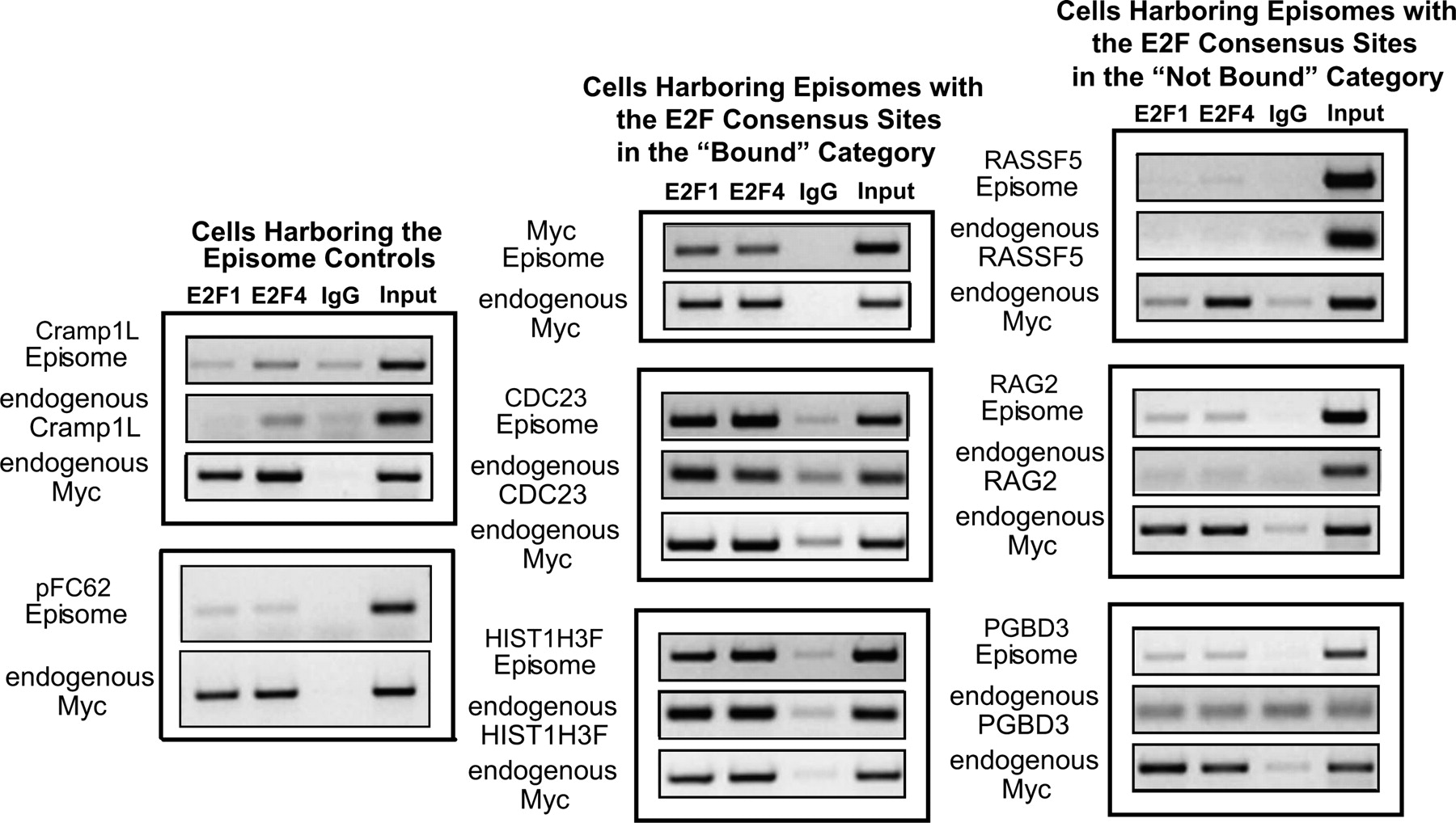 Establishment of the eChIP assay. (Left) Analysis of E2F1 and E2F4 ChIP samples in cells harboring the episomal negative controls: the empty episomal vector (left, bottom) and an episome containing a portion of the transcribed region of CRAMP1L (left, top). (Middle) Binding of E2F1 and E2F4 to episomes containing a 500-bp fragment of the MYC, CDC23, or HIST1H3F promoters, all of which possess a consensus E2F motif and were previously shown to be bound by E2Fs in the ChIP-chip experiments. (Right) Binding of E2F1 and E2F4 to episomes containing a 500-bp fragment of the RASSF5, RAG2, or PGBD3 promoters, all of which possess a consensus E2F motif, but were previously shown not to be bound by E2Fs in the ChIP-chip experiments. For all experiments, IgG was used as a negative control antibody and binding to the endogenous MYC promoter was analyzed as a positive control for E2F enrichment. Furthermore, the binding of E2F1 and E2F4 to the corresponding endogenous promoters was analyzed in all of the eChIP samples.