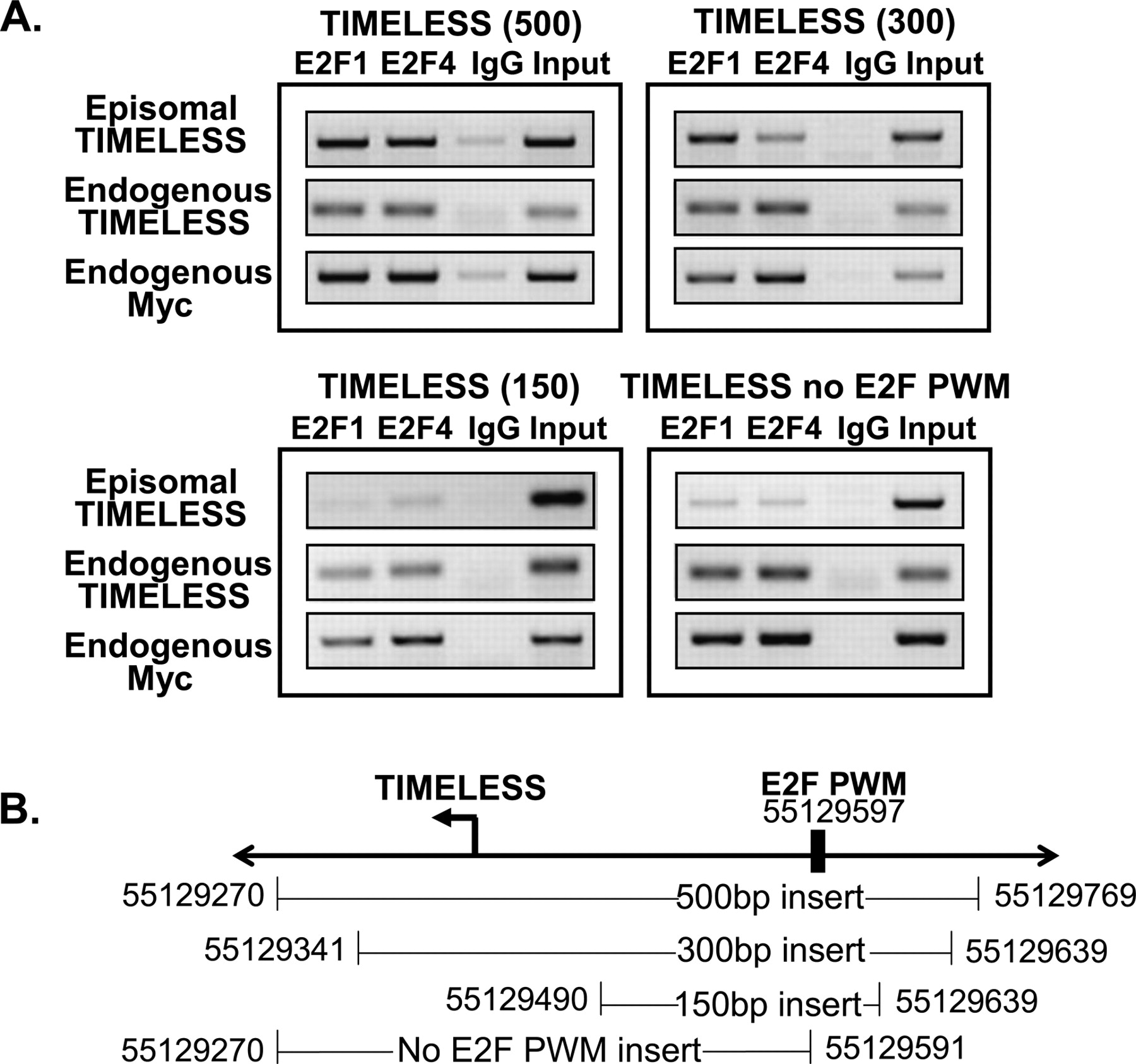 Delineation of the E2F recruitment site at the TIMELESS promoter. (A) Binding of E2F1 and E2F4 to various fragments of the TIMELESS promoter is shown. The binding of E2F1 and E2F4 to the endogenous TIMELESS promoter and to the endogenous MYC promoter was also analyzed in the same samples as positive controls. (B) A schematic of the hg17 chromosomal coordinates of the tested fragments of the TIMELESS promoter is shown; the location of the best match to the E2F positional weight matrix (PWM) within the cloned in region is also indicated.