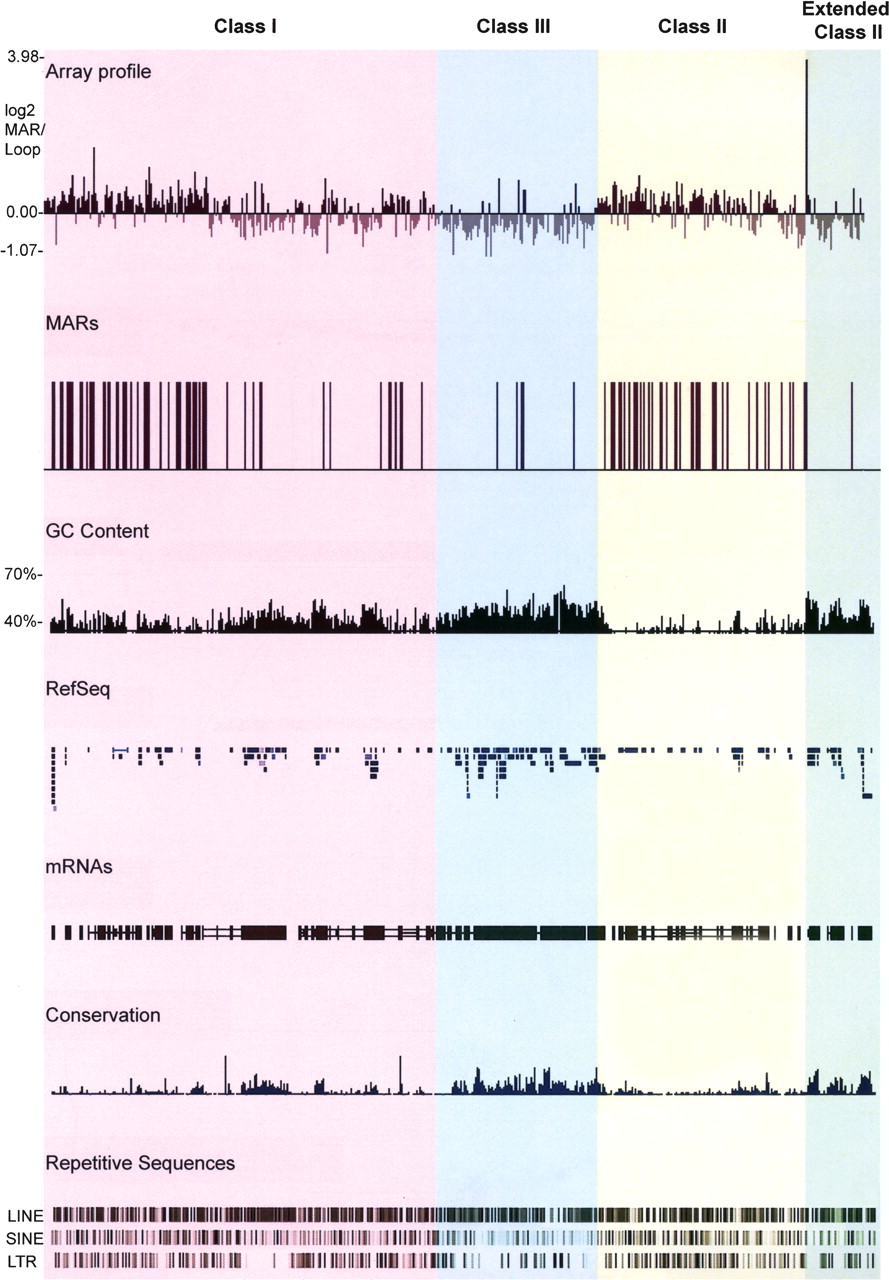 MARs in the MHC of fibroblasts identified using genomic tiling path arrays. MAR and loop DNA fractions were differentially labeled with Cy3 and Cy5 fluorophores and competitively hybridized onto the MHC microarray platform. The log2 ratios of MAR/loop DNA were then calculated and plotted using the UCSC genome database (http://genome.ucsc.edu/). Datapoints with log2 enrichment values > 0.4 were regarded as MARs, plotted on the UCSC genome database, and represented as vertical black bars. The GC content, the RefSeq genes, the human mRNAs from GeneBank, regions of conservation between 17 vertebrate species, and the repetitive sequences LINE, SINE, and LTR across the MHC are shown below the array data. The different regions of the MHC are highlighted in different colors: classical class I, pink; classical class III, blue; classical class II, yellow; and extended class II, green. This color scheme is used in subsequent figures.