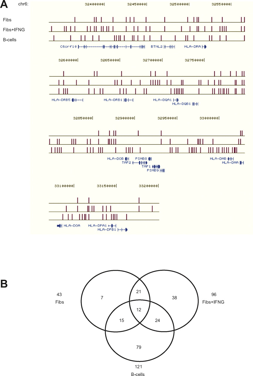 Comparison of MARs in the MHC class II region in fibroblasts, IFNG-induced fibroblasts, and B-lymphoblastoid cells. (A) MARs are shown relative to RefSeq genes from the UCSC web browser (http://genome.ucsc.edu/). The distribution of MARs across the entire MHC is shown in Supplemental Figure 2. (B) Venn diagram of MARs in the class II region in the different cell types.