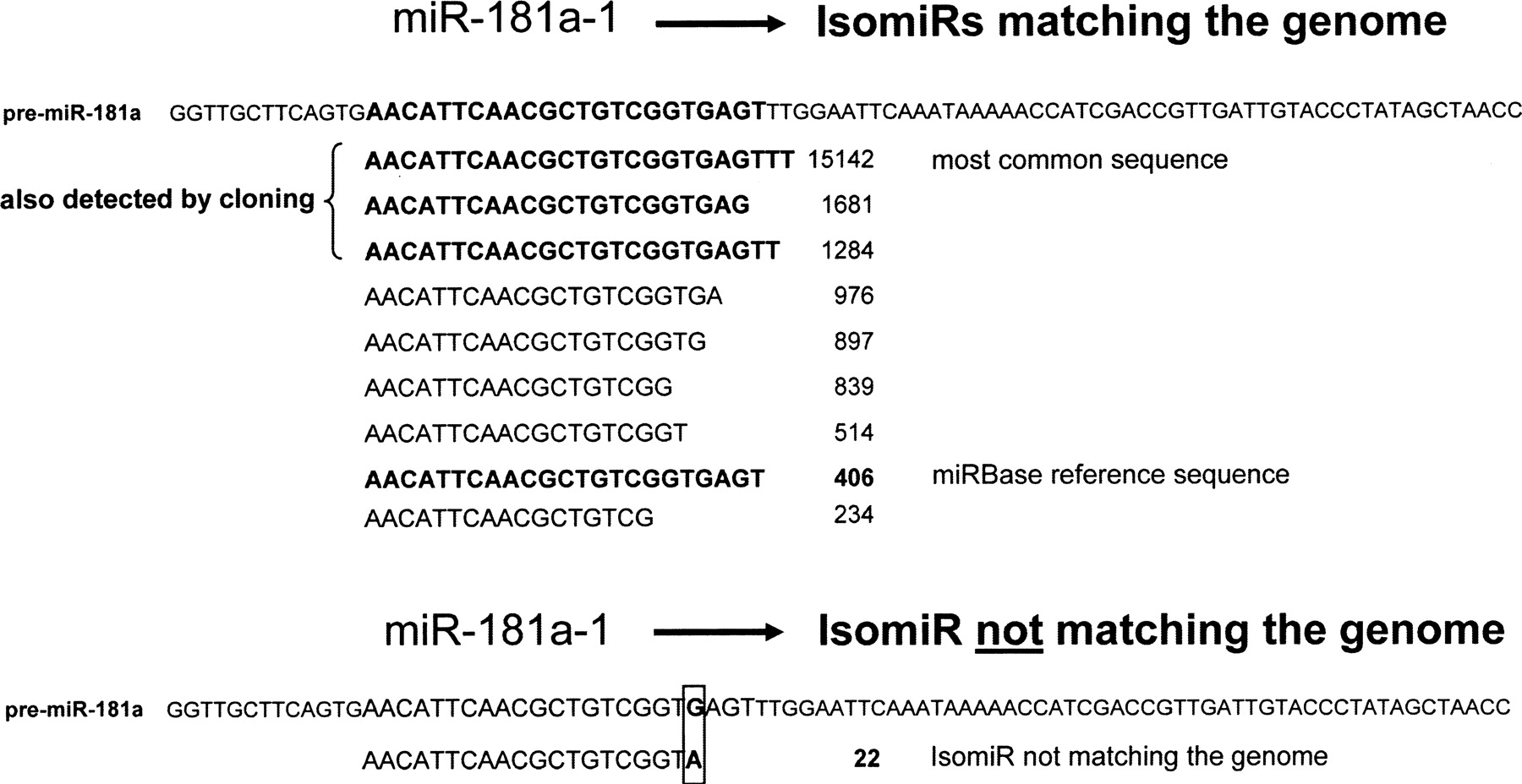 Example of high frequency of miRNA sequence variation (isomiRs). Shown are the unique sequences and number of times this sequence was detected matching the pre-miRNA sequence of miR-181a. The most frequent occurring miR-181a sequence is not in accordance with the miRBase reference sequence. The three most common sequences were also detectable by linker-based cloning, as indicated in the figure. An example of a miR-181 isomiR not matching the genome is shown in the bottom part of the figure.