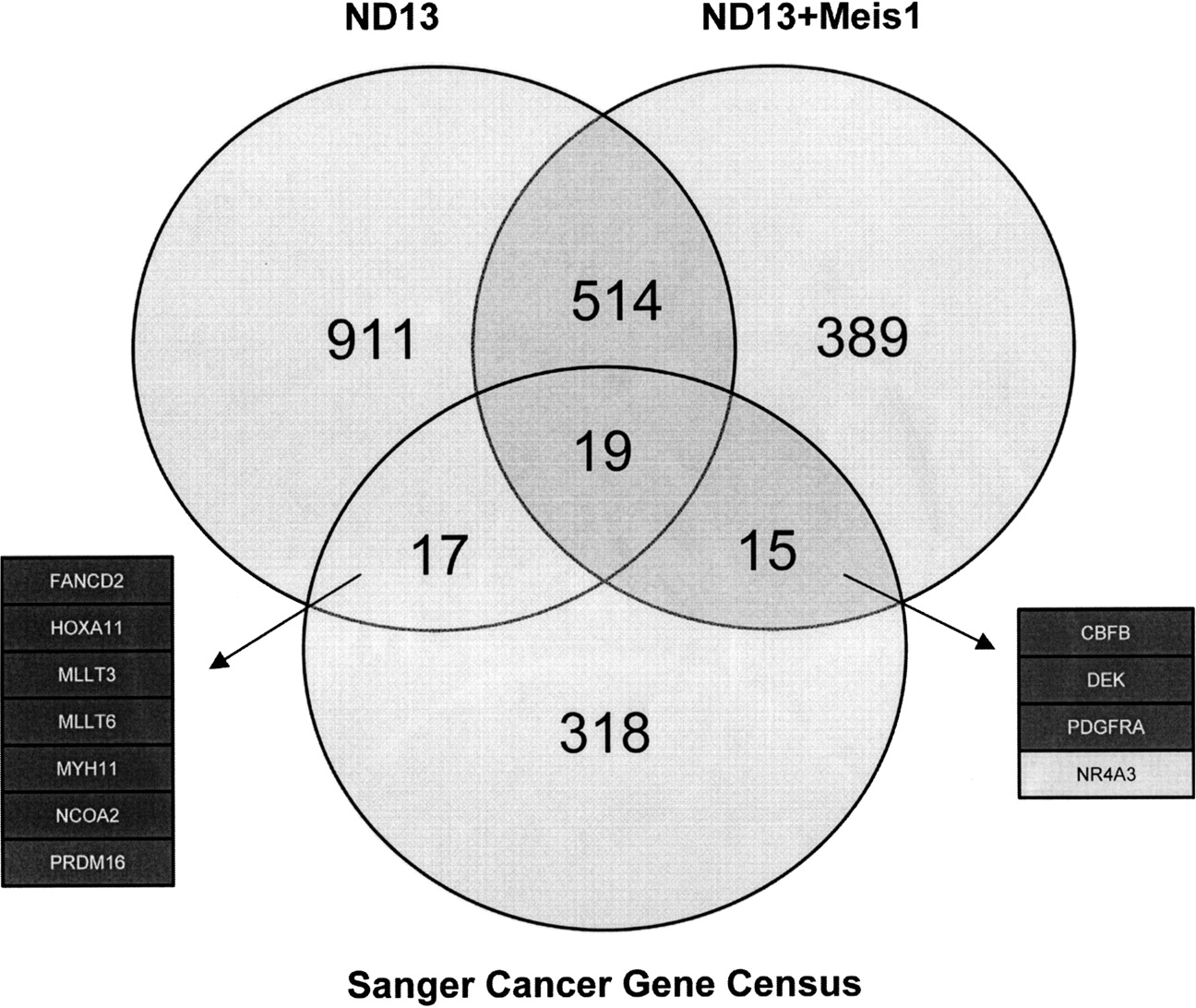 Venn diagram of the predicted miRNA targets for the 19 most abundant miRNAs from each library and their shared targets with the Sanger Cancer Gene Census. The dark boxes indicate AML-specific oncogenes, whereas the gray box highlights a tumor suppressor gene targeted by miRNAs enriched in ND13+Meis1 cells.
