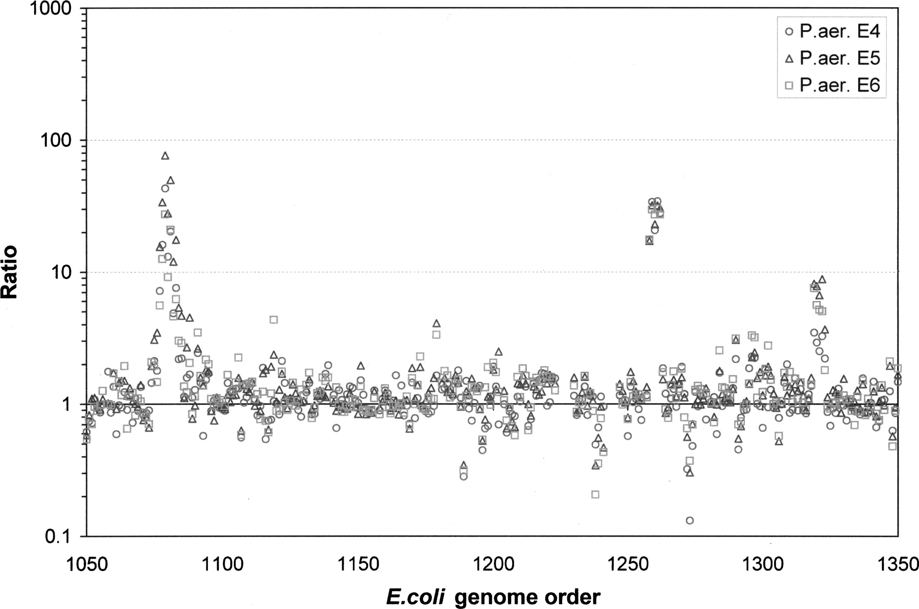 Host response to P. aeruginosa clone propagation. The transcription ratio between P. aeruginosa BACs–E. coli hybrid cells and native E. coli was calculated for a short contiguous section of the E. coli genome encompassing 300 genes. The point clusters at 1075, 1260, and 1325 correspond to the flagellar gene cluster, the oligopeptide ABC transporter operon, and the psp operon, respectively.