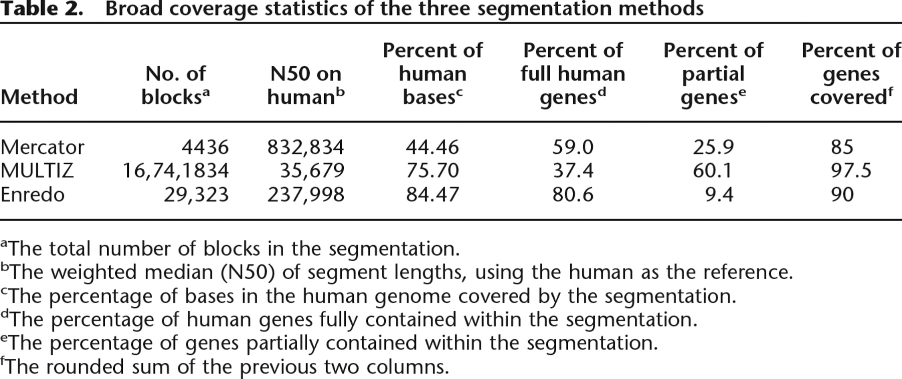 bThe weighted median (N50) of segment lengths, using the human as the reference.