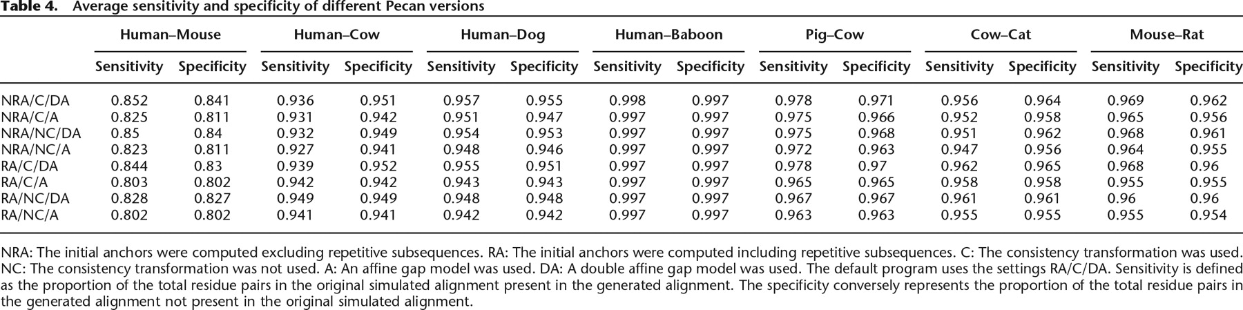 NRA: The initial anchors were computed excluding repetitive subsequences. RA: The initial anchors were computed including repetitive subsequences. C: The consistency transformation was used. NC: The consistency transformation was not used. A: An affine gap model was used. DA: A double affine gap model was used. The default program uses the settings RA/C/DA. Sensitivity is defined as the proportion of the total residue pairs in the original simulated alignment present in the generated alignment. The specificity conversely represents the proportion of the total residue pairs in the generated alignment not present in the original simulated alignment.