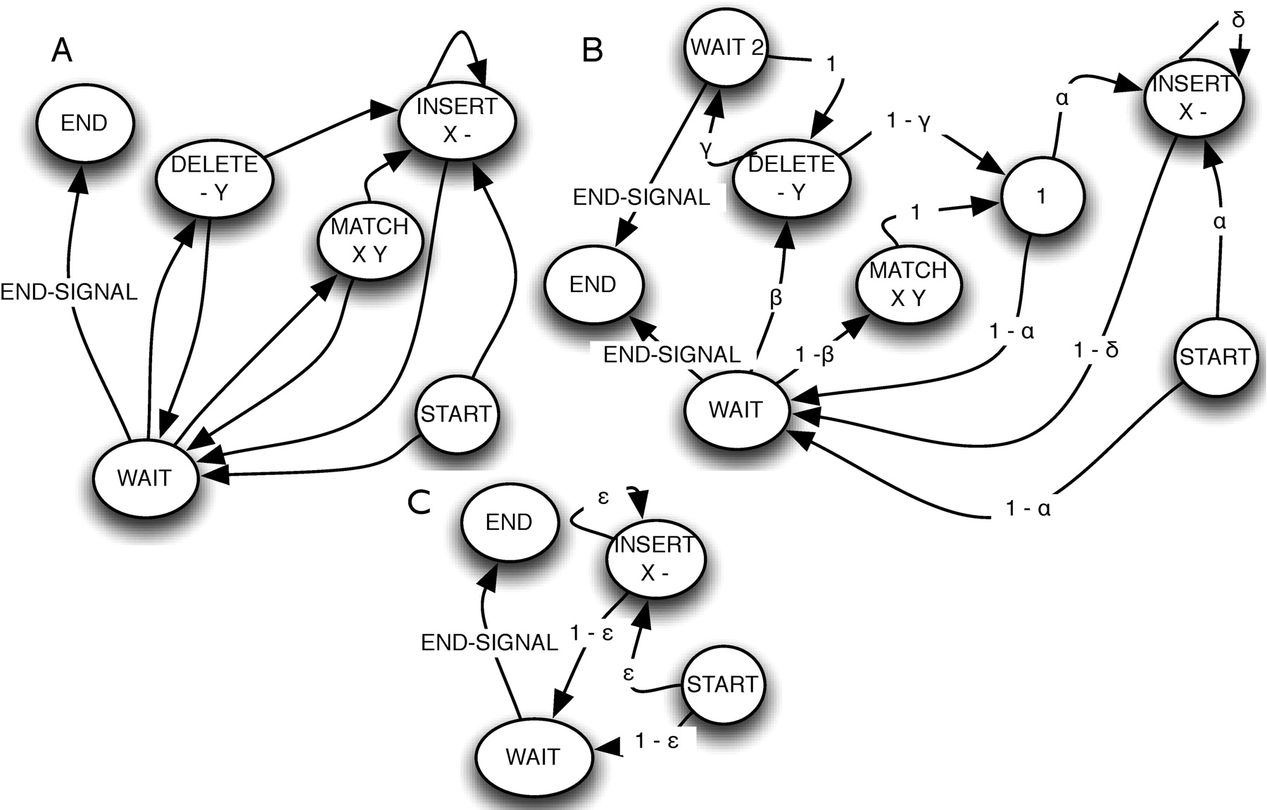 Branch transducers and sequence graphs. State diagrams showing transducers. (A) A simple branch transducer. The START, END, WAIT, and unlabeled states are silent states. Emissions are labeled beneath the state name. Output emissions to the descendant sequence are labeled X, and input symbols from the ancestor are labeled Y; gaps are labeled “–”. (B) An affine branch transducer with labeled transition parameters. (C) Root branch transducer with labeled transition parameters.