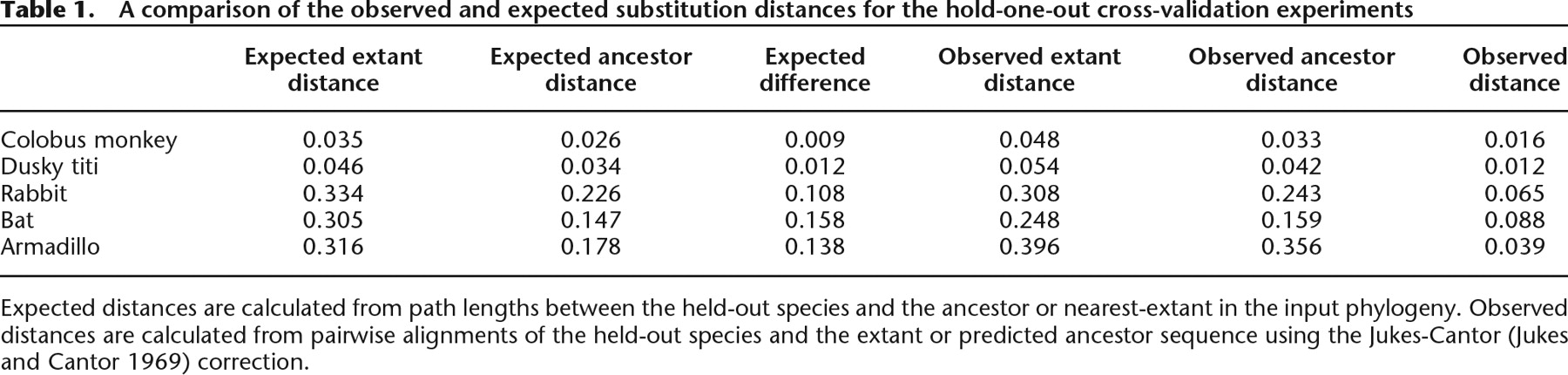 Expected distances are calculated from path lengths between the held-out species and the ancestor or nearest-extant in the input phylogeny. Observed distances are calculated from pairwise alignments of the held-out species and the extant or predicted ancestor sequence using the Jukes-Cantor (Jukes and Cantor 1969) correction.