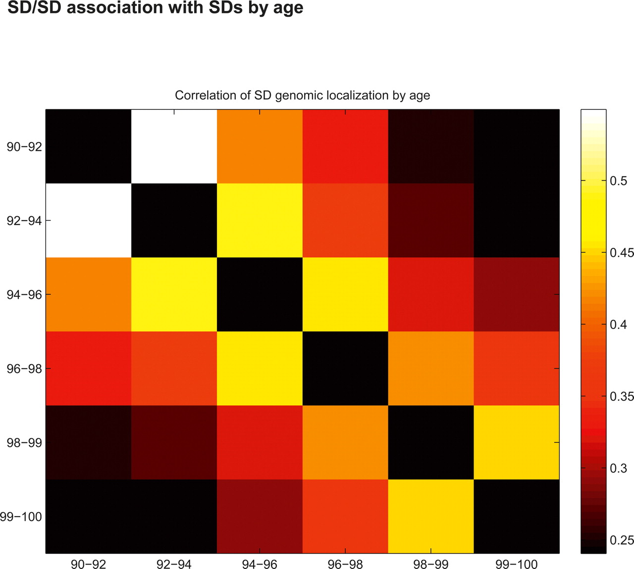 Heatmap of associations of SDs in different sequence identity bins. SDs co-occur best with pre-existing SDs of similar age, and this trend appears to be stronger for older SDs. Associations are given as Spearman rank correlations of the number of occurrences in genomic bins. All correlations are highly significant (P-value ≪ 0.00001).