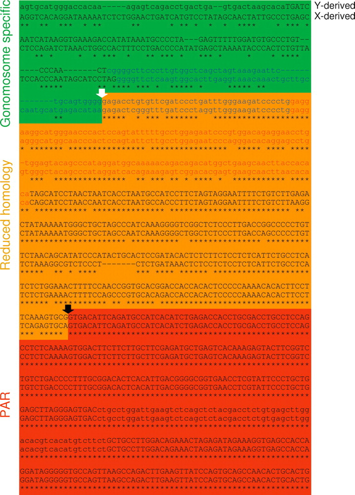 Bovine pseudoautosomal boundary (PAB). Corresponding Y- and X-derived sequences were aligned using ClustalW, revealing (1) a region of near perfect homology (red) corresponding to the PAR, (2) a region of reduced homology (orange) resulting from the displacement of the PAB by attrition, and (3) nonhomologous gonosome-specific segments (green). (Black arrow) Present-day bovine PAB, (white arrow) ancestral PAB. (Lowercase letters) Repetitive sequences, (uppercase letters) unique sequences. (Red) Monomer domain of the Bov-tA repeat overlapping the ancestral PAB, (blue) tRNA-like domains differentiating the Bov-tA1 repeat of the X and the Bov-tA2 repeat of the Y.