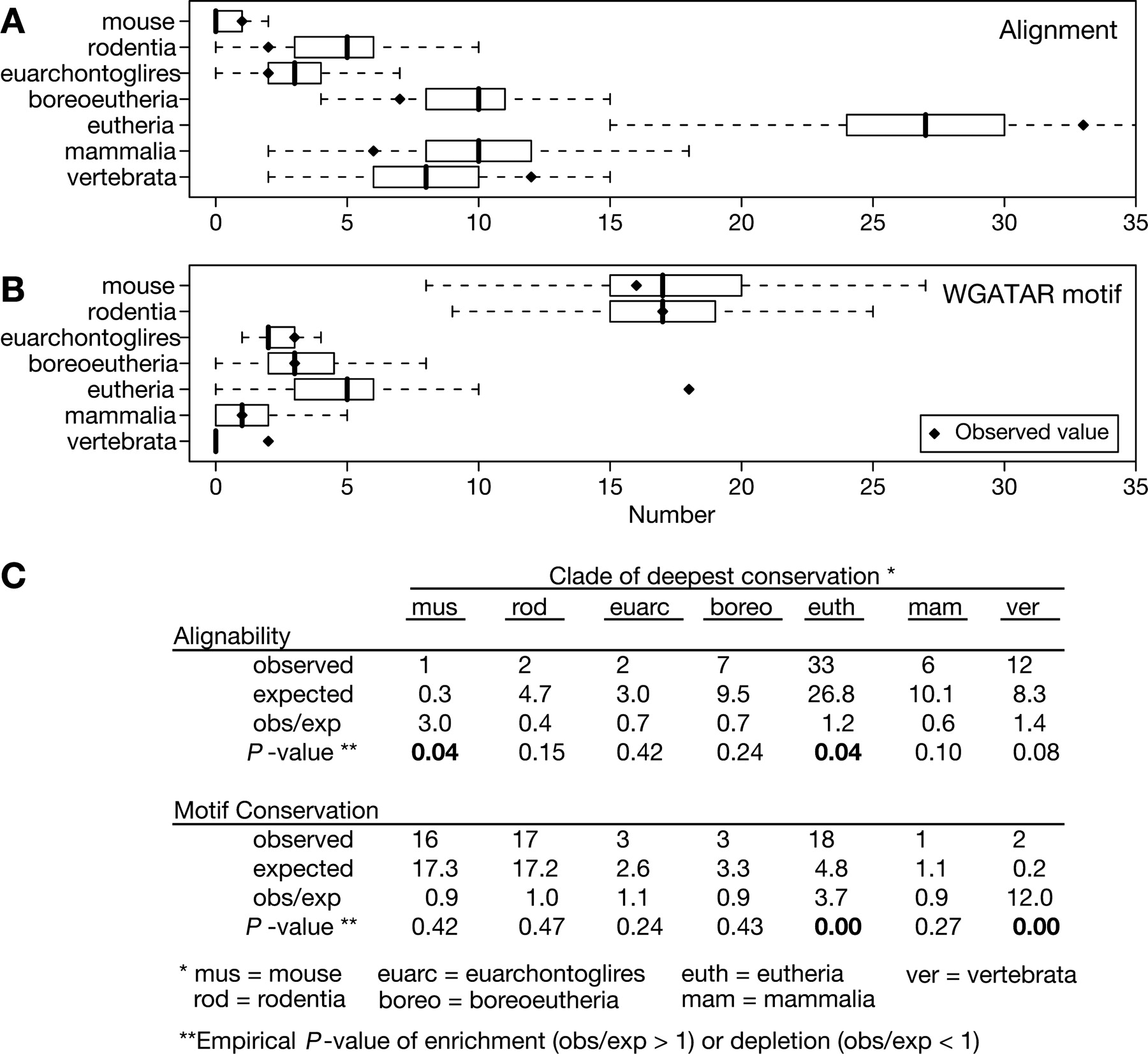 Conservation of the DNA segments occupied by GATA1 and preservation of the GATA1 binding site motifs within those segments. The 63 GATA1 occupied segments were classified by phylogenetic conservation of sequence (A) and preservation of WGATAR motifs (B), i.e., the motif aligns to the designated clade and still retains a match to WGATAR. Solid diamonds represent the observed number of occupied segments showing conservation of the DNA segments or preservation of the WGATAR motif in the designated clade but no further. The distributions of the same classification found in 1000 iterations of randomly sampling 63 DNA intervals from the nonrepetitive portions of the 66-Mb target region are shown as box plots. The box line is the median, box width is the interquartile range, and whiskers extend to the most extreme data point that is no more than 1.5 times the interquartile range. (C) The observed and expected frequencies of conservation. The mean number of times that a designated clade of deepest conservation is found in the 1000 random samplings is taken as an estimate of the expected value. The ratio of the observed to expected number of times that a given extent of conservation is seen indicates the level of enrichment (ratio > 1) or depletion (ratio < 1). Comparison of the observed value to the distribution of values for the random samplings gives the associated empirical P-values for enrichment or depletion; the P-values < 0.05 are in boldface type.